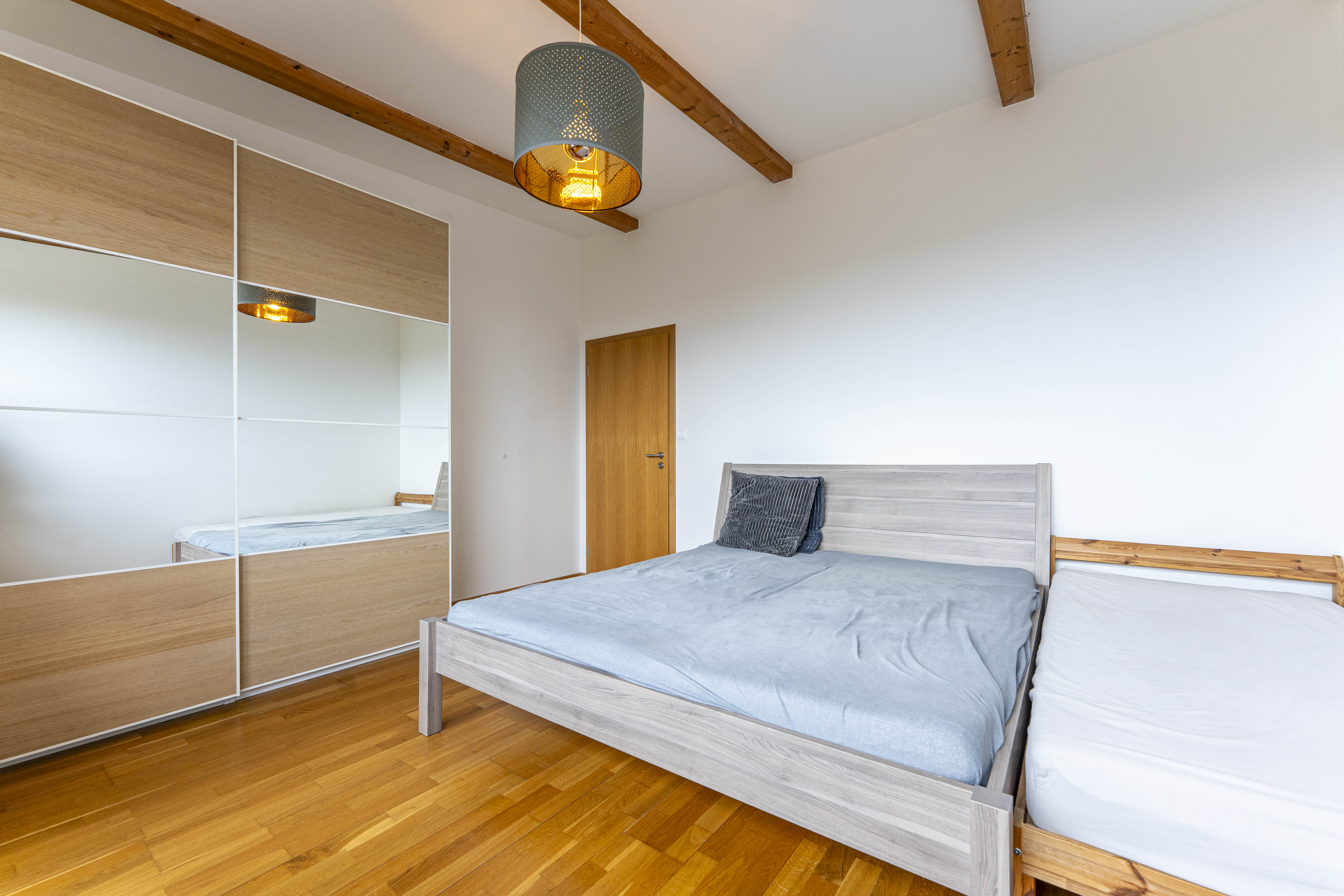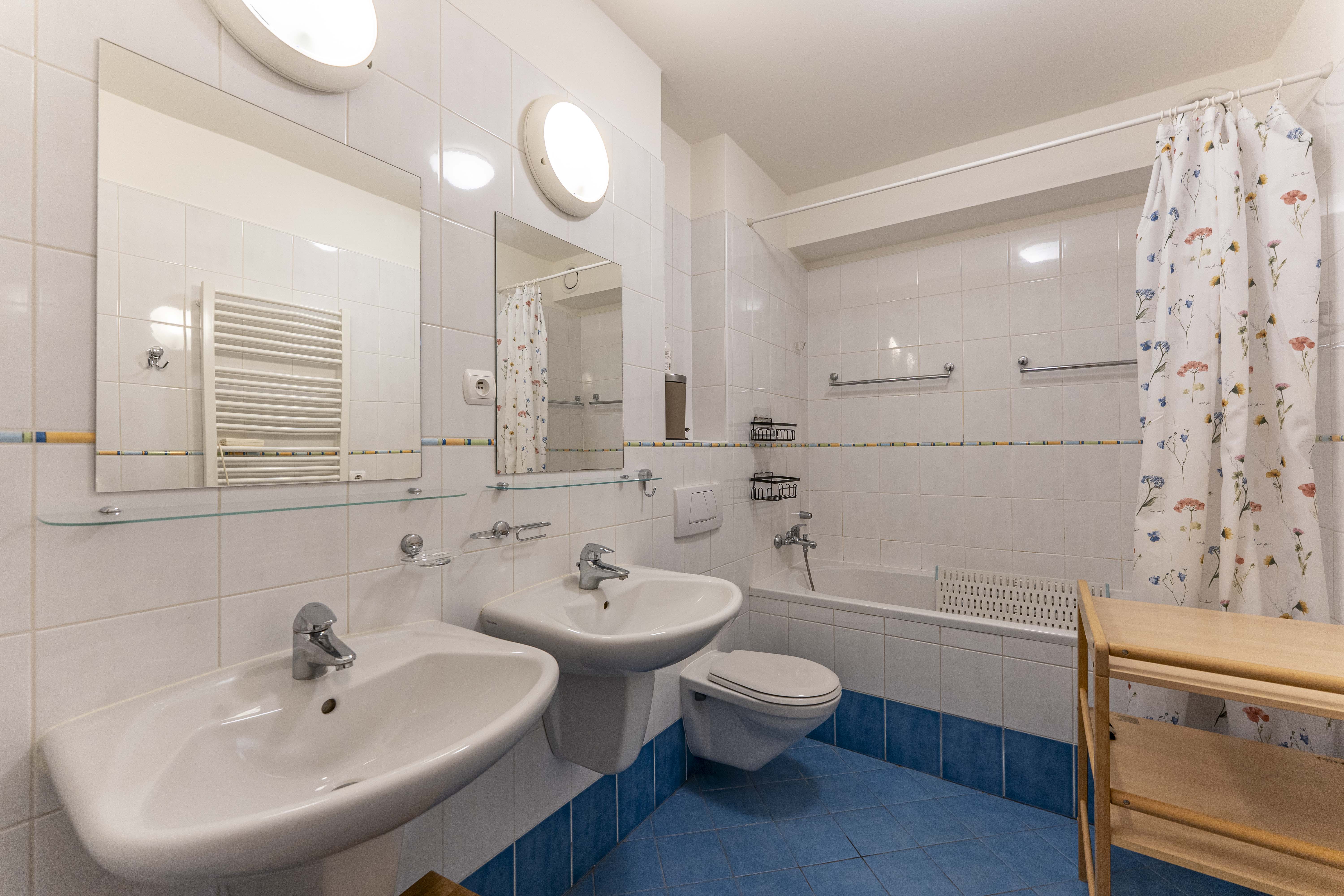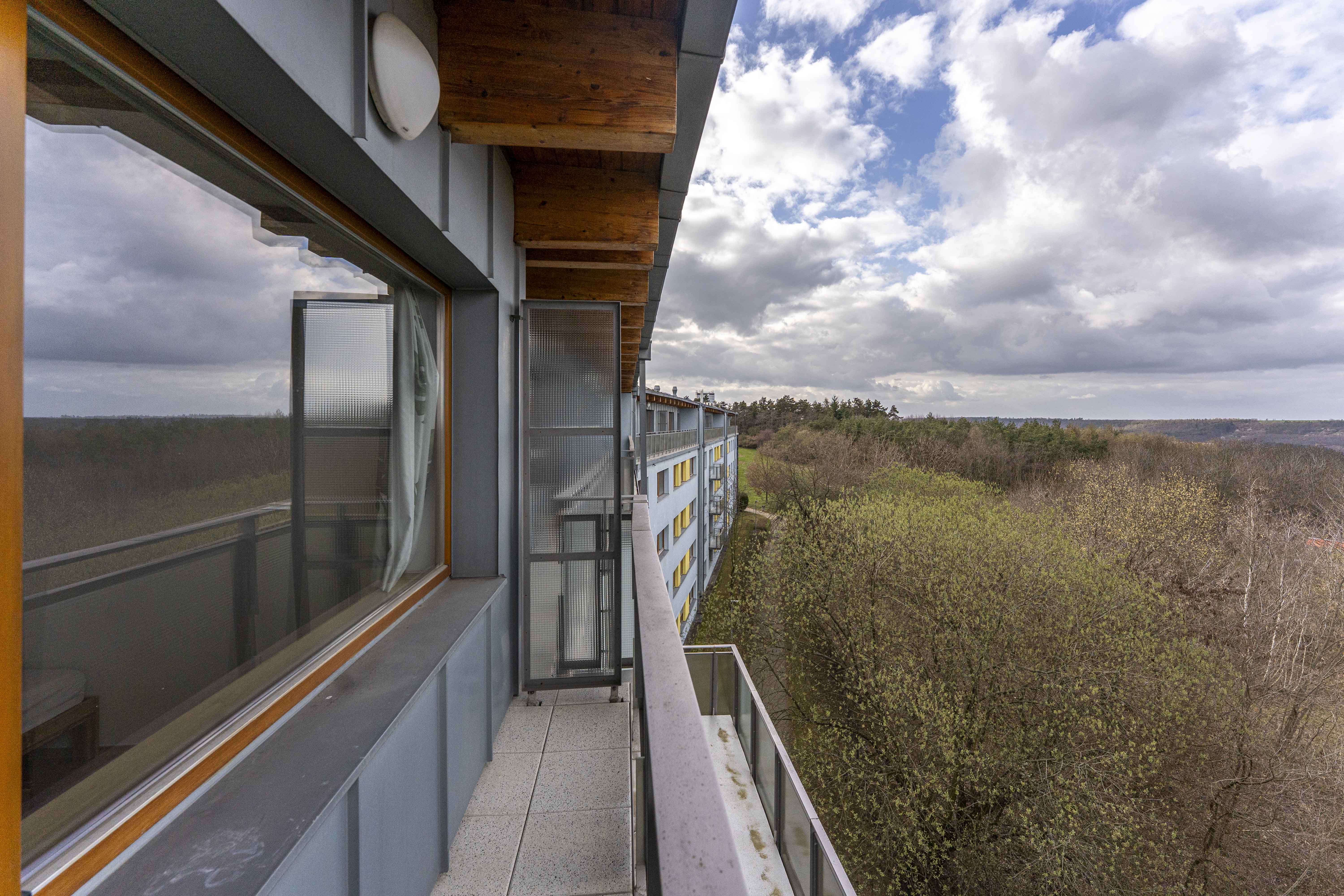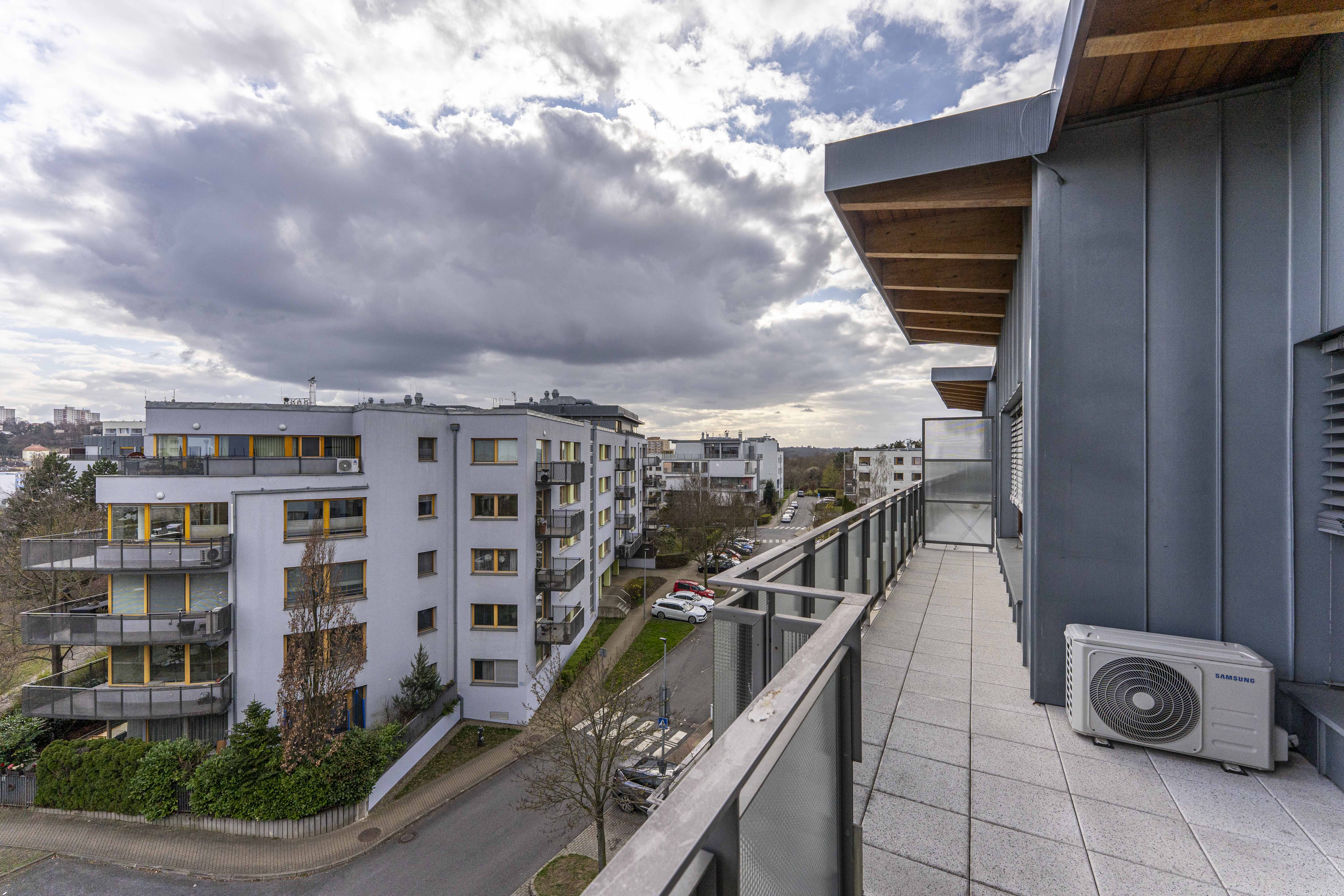 Dále jsou zde 2 ložnice, koupelna s vanou, další koupelna s toaletou pračkou a sušičkou. Ložnice mají vstup na další, již o něco menší terasa s výhledy na Šárecké údolí a Nebušice.