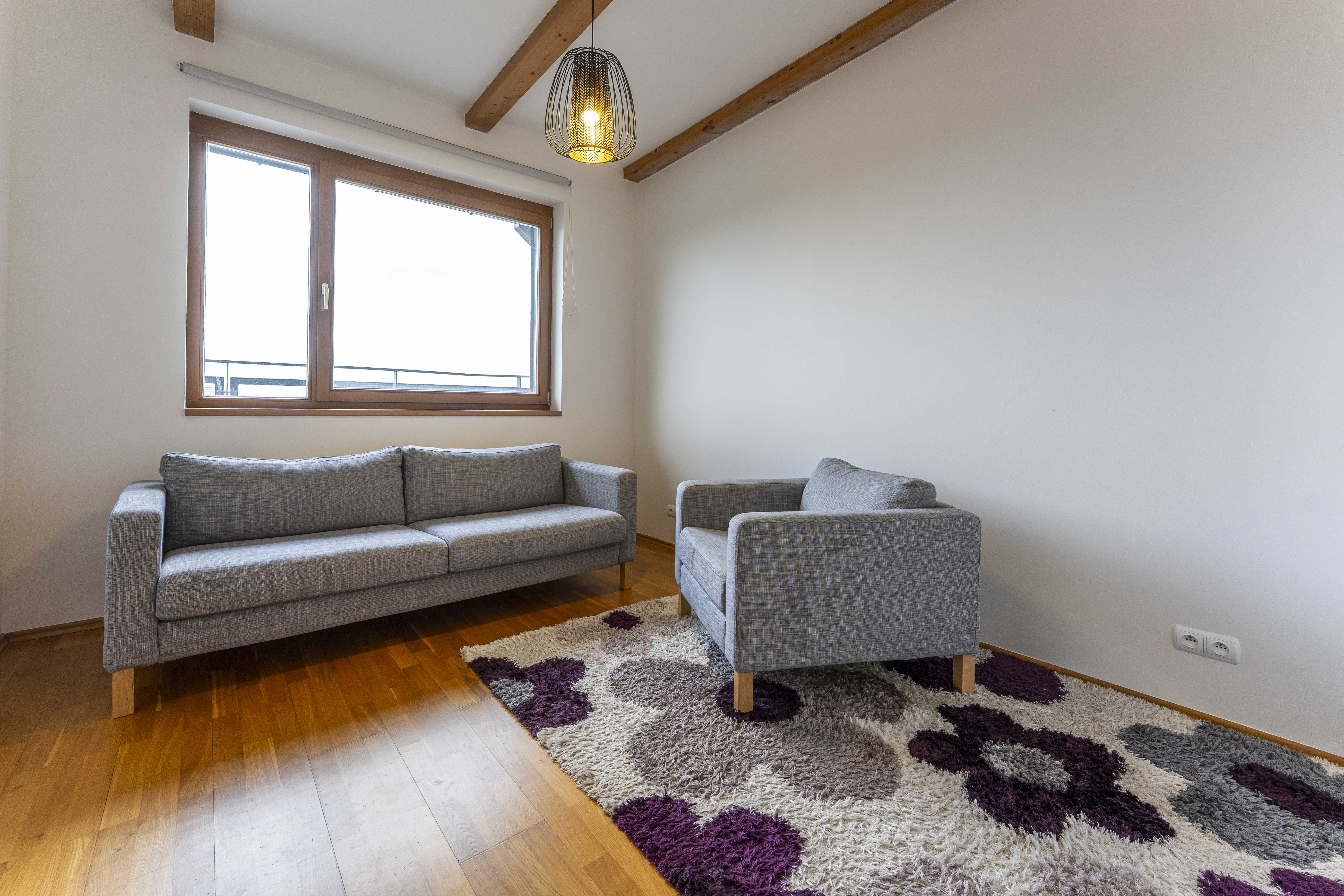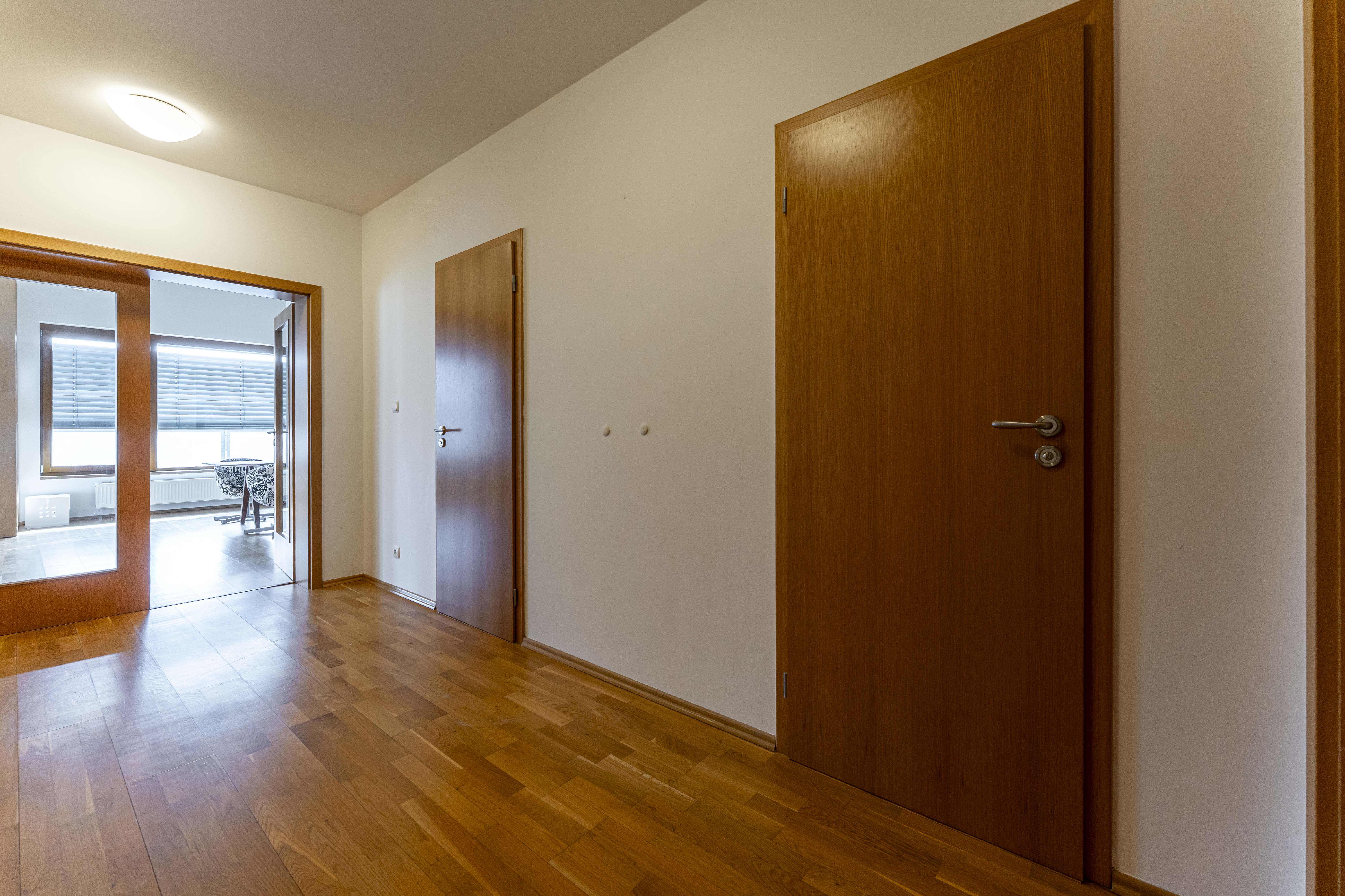 Vzdušnému bytu v posledním 4. patře domu má vévodí prostorný a vzdušný obývací pokoj s kuchyní a vstupem na velkou terasu. Pokoj je světlý s jižní orientací, z terasy jsou pěkné výhledy na okolí.