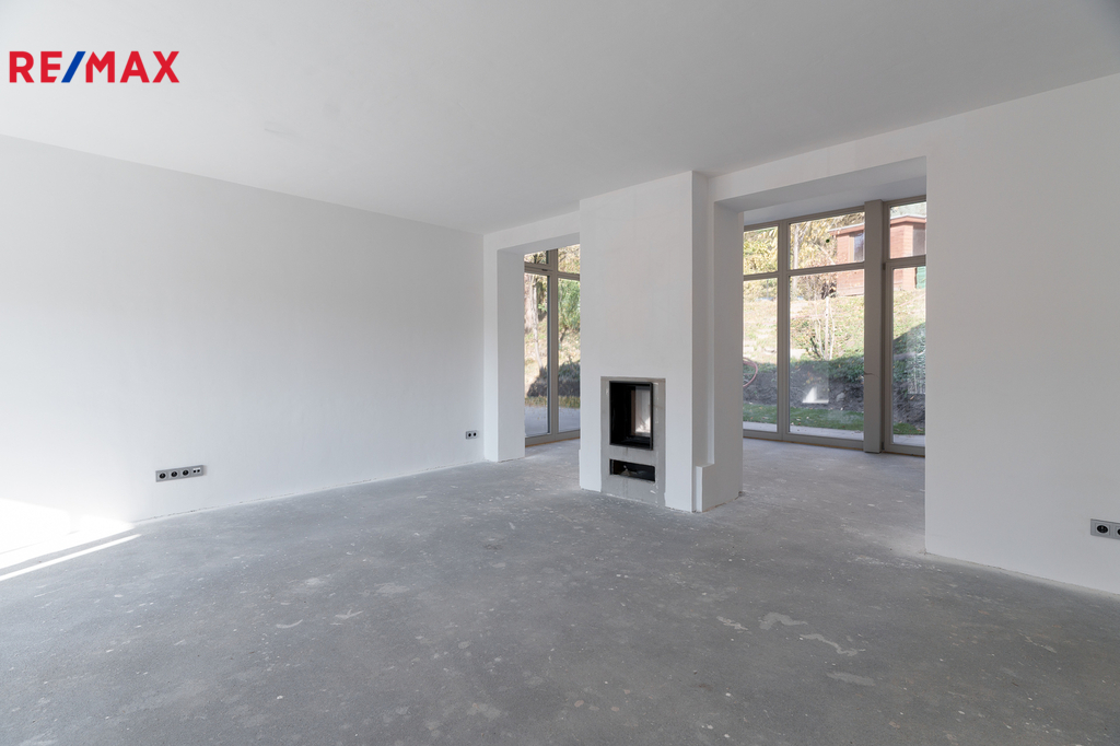 Dominantou interiéru je velkorysý obývací pokoj s krbem a skleněnou stěnou, plynule propojený s jídelnou a kuchyní, které tvoří centrum celého bytu. Velká francouzská okna zajišťují dostatek denního světla a umožňují vstup na balkon s výhledem do zeleně.