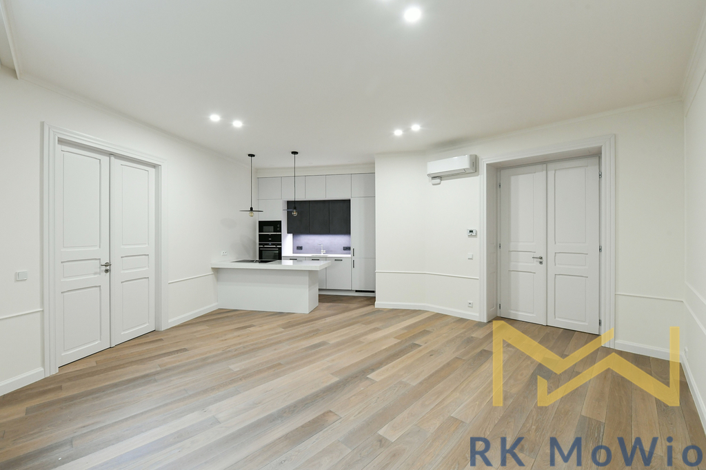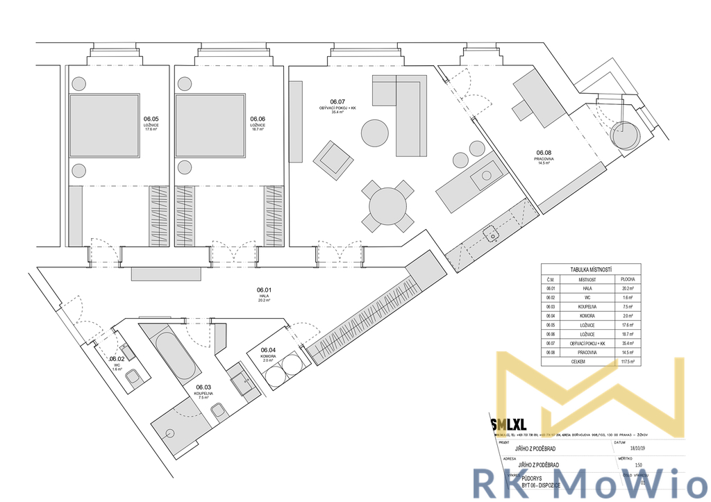 Dispozice bytu zahrnuje vstupní chodbu, vzdušný obývací pokoj s kuchyňskou linkou, dvě ložnice a pracovnu. Z chodby lze vejít do koupelny, na samostatnou toaletu a do komory. Celý byt je pokryt masivními dubovými podlahami, které dodávají interiéru elegantní a útulnou atmosféru. Byt je vybaven nádhernými novými okny, s dvouvrstvým sklem. Koupelna a toaleta jsou obloženy krásným šedým mramorem. K bytu je nutno pronajmout 1 parkovací stání za příplatek 7.865,- Kč/měsíc včetně DPH.