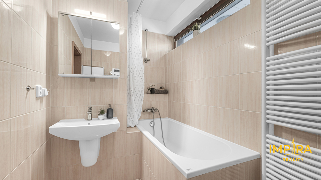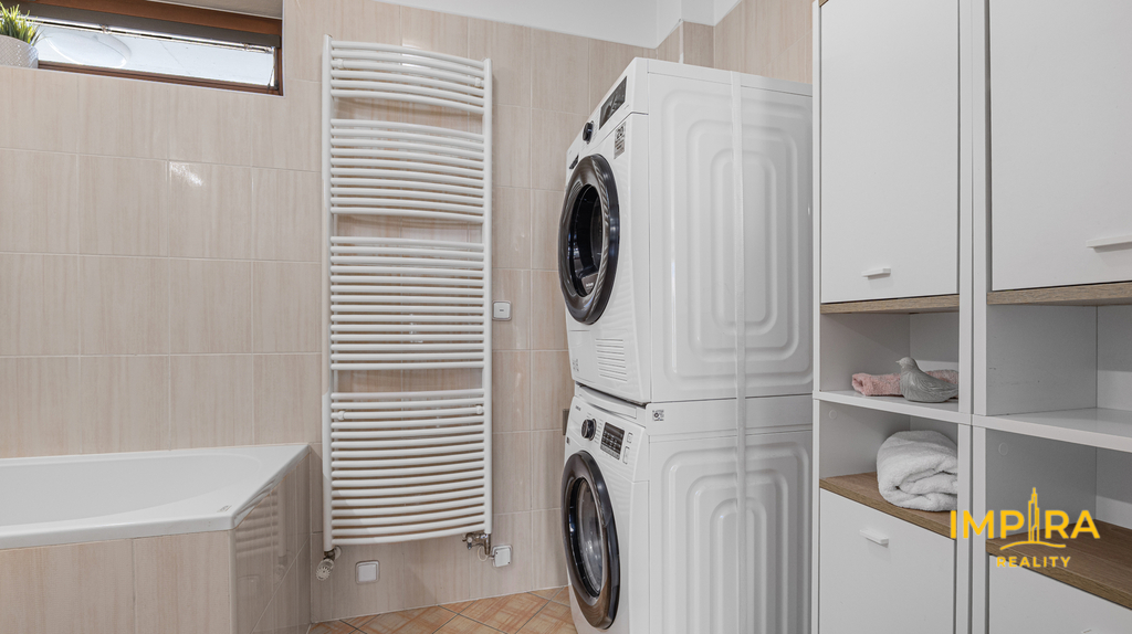 Komfortní zázemí: Koupelna s vanou a oknem, samostatné WC, nová pračka se sušičkou Samsung.