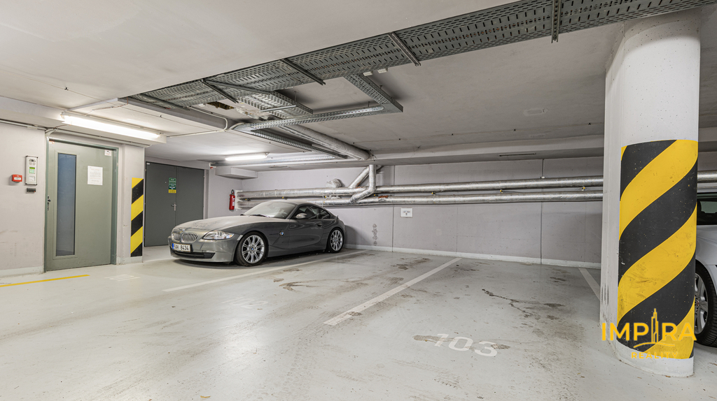 Vlastní garážové stání: Parkování v podzemních garážích přímo v domě je zahrnuto v nabídce.