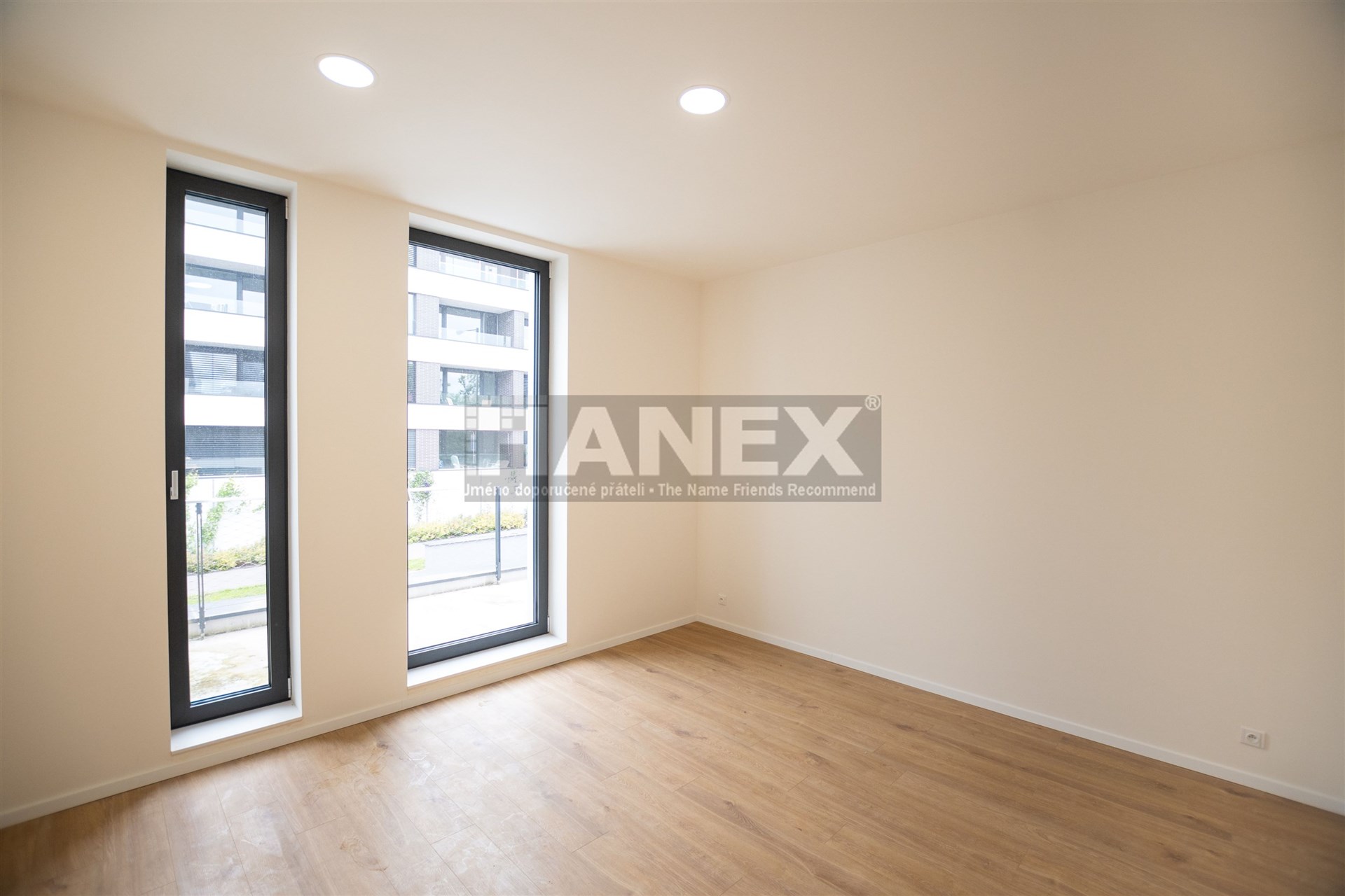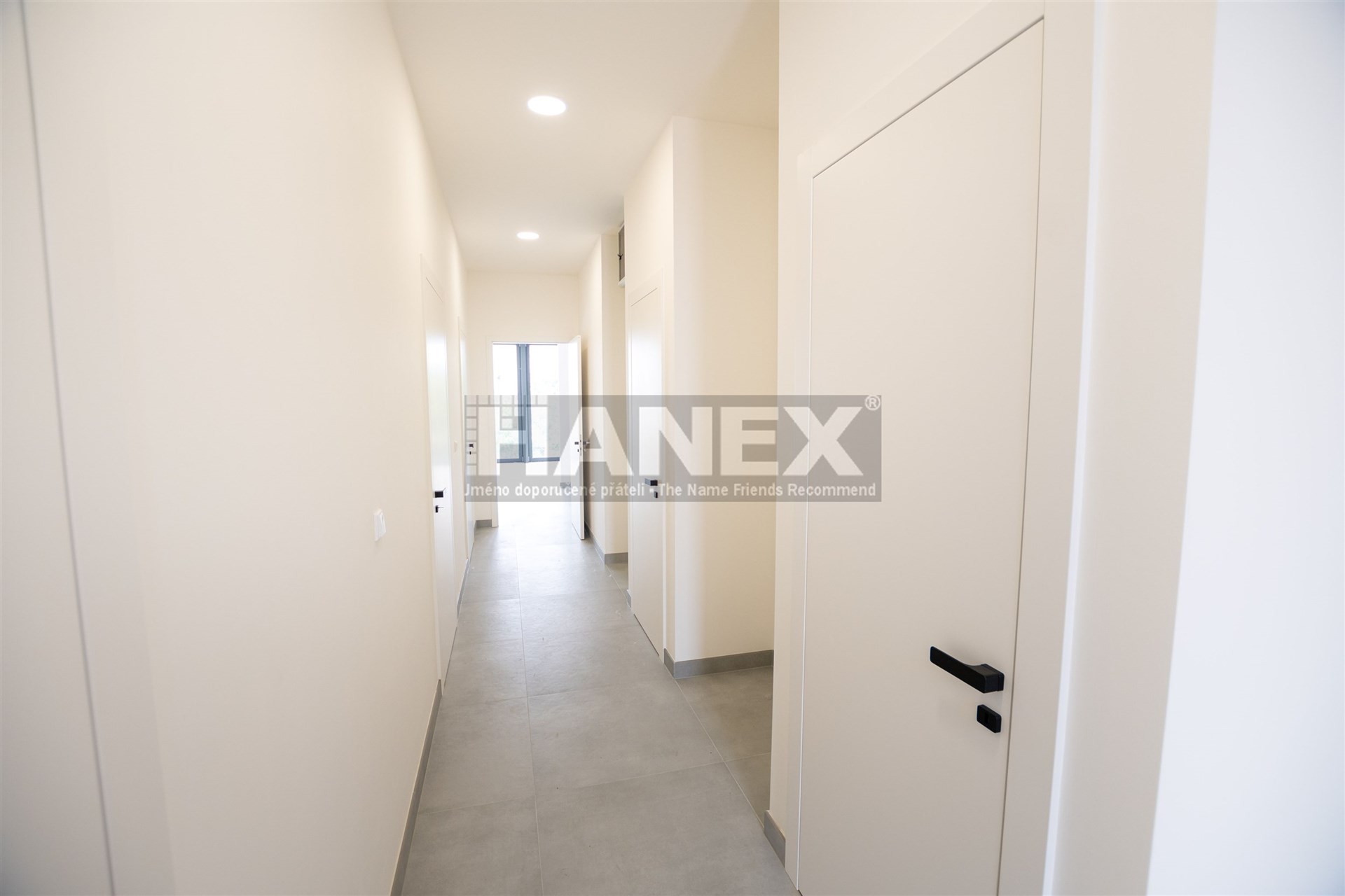 Přehlednou dispozici bytu tvoří obývací pokoj s kuchyňským koutem, toaletou, dvěma koupelnami, třemi ložnicemi. K bytu patří rozhlehlá terasa a dvě parkovací stání. Jedno v garáži s přípravou pro dobíjení elektromobilu a druhé venku na pozemku.