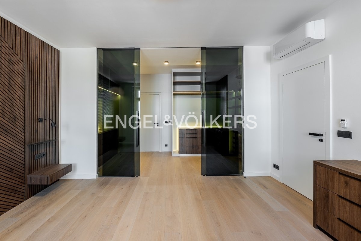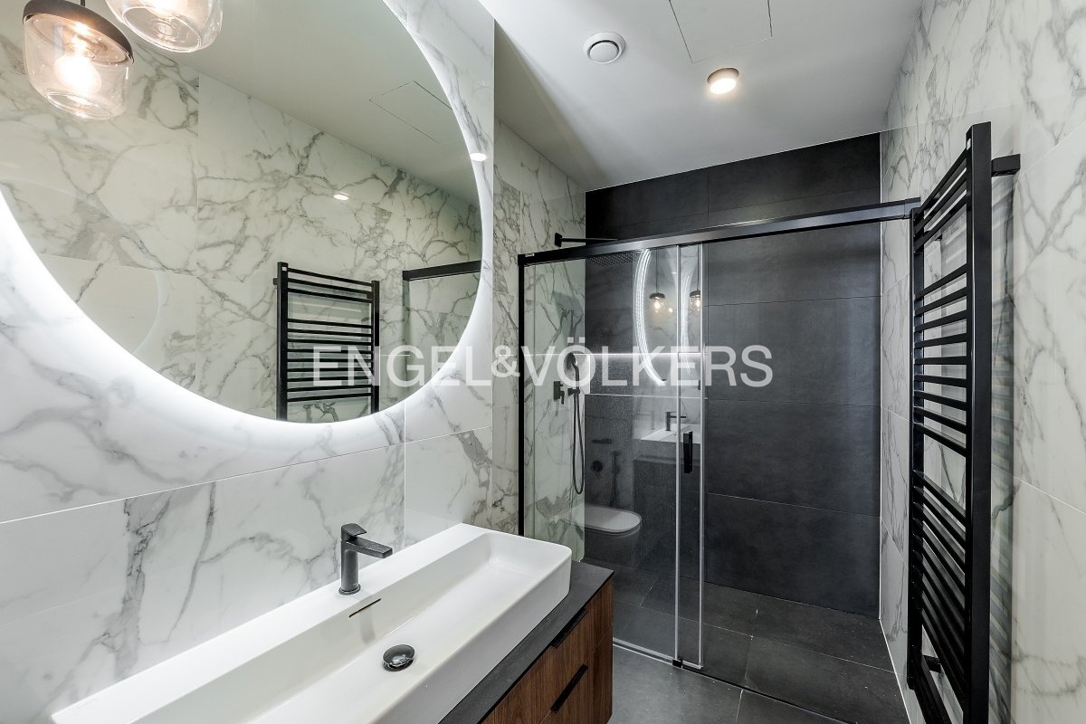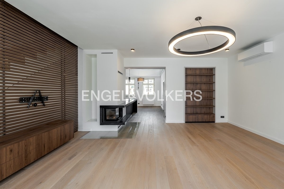Moderní a vzdušná dispozice bytu, kdy se ve vstupním podlaží nachází prostorný obývací pokoj s krbem a vstupem na terasu, plně vybavenou kuchyní Gemadecor, ložnice s vlastní šatnou a en-suite koupelnou, technická místnost a extra toaleta. Ve druhém patře se nachází prostorná koupelna s vanou a 2 samostatné ložnice, které jsou orientované do klidného vnitrobloku se vstupem na druhou terasu.