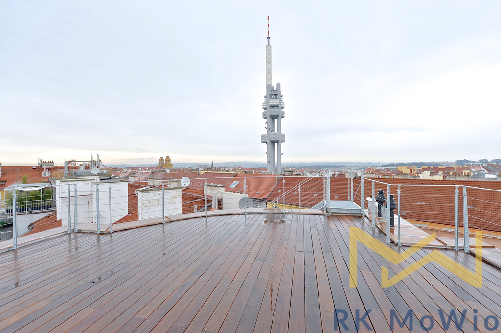 Nabízíme k pronájmu podkrovní byt bez nábytku, o dispozici 2+kk s podlahovou plochou 60 m² s 2 terasami (o výměře 40 m² a 60 m²), situovaný v 5. patře (6. nadzemní podlaží) zrekonstruované secesní budovy s výtahem, na náměstí Jiřího z Poděbrad na Praze 3, ve vyhledávané lokalitě Vinohrad.