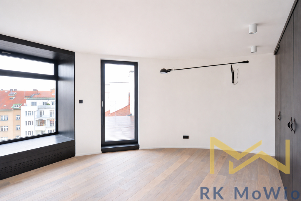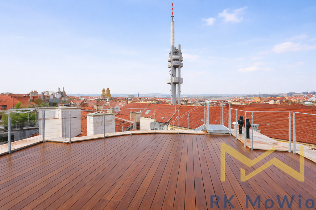 Unikátní bytová jednotka disponuje vstupní chodbou, vzdušným obývacím pokojem s kuchyňským koutem a jídelní částí, 1 ložnicí s vestavěnými skříněmi, 1 koupelnou (se sprchou a umyvadlem), oddělenou toaletu. Dominantou bytu je rozlehlá terasa přístupná z obývacího pokoje se schody na střešní terasu s panoramatickým výhledem. Vybavení bytu: kuchyňská linka včetně lednice s mrazákem, sklokeramické varné desky, digestoře, myčky a elektrické trouby; vestavěné skříně, pračka, sušička, vinotéka, klimatizace, příprava pro vysokorychlostní internet, dřevěné dubové podlahy, nová okna s dvouvrstvým sklem. K bytu je nutno pronajmout 1 parkovací stání za příplatek 6.500,- Kč/měsíc + DPH21% = 7.865,- Kč/měsíc.