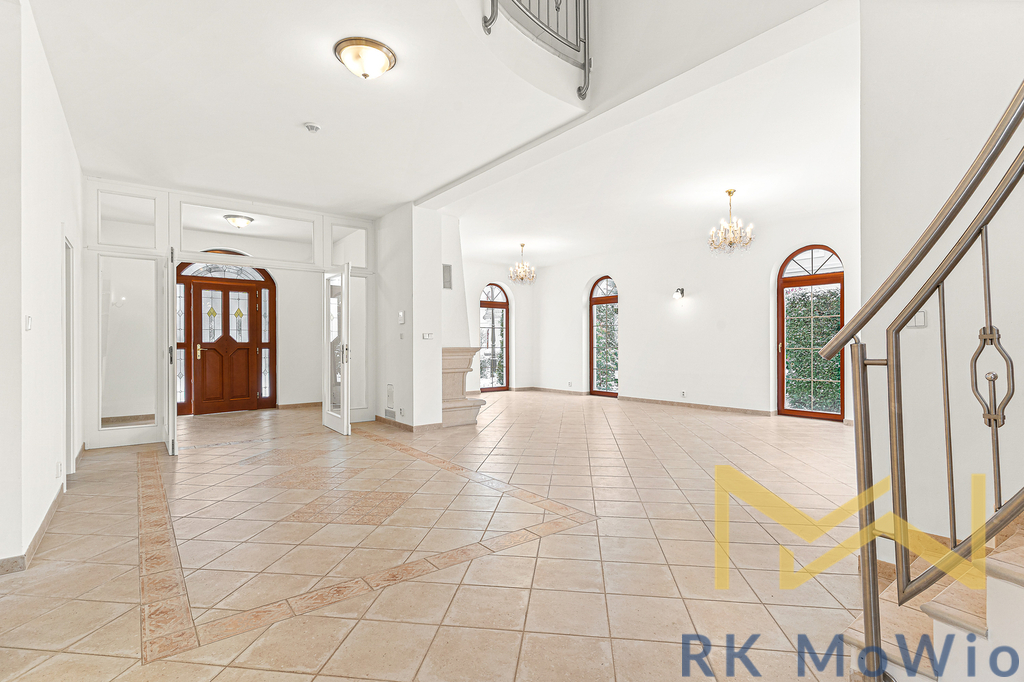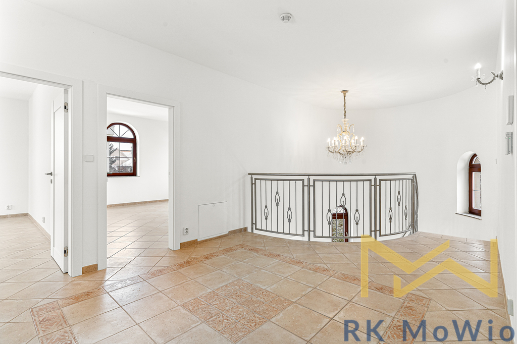V přízemí nemovitost disponuje zádveřím a vstupní halou, prostorným obývacím pokojem s jídelním prostorem, krbem a vstupem na terasu, kuchyňským koutem, komorou, šatnou a toaletou pro hosty. Z obývacího pokoje vedou schody do 1. patra, kde naleznete halu, hlavní ložnici s vlastní koupelnou, 2 dětské pokoje, pokoj pro hosty s vlastní koupelnou, 1 koupelnu se vstupem na terasu a samostatnou toaletu. Další vybavení domu: kuchyňská linka včetně lednice s mrazákem, sklokeramické varné desky, digestoře, horkovzdušné a mikrovlnné trouby, myčky; vestavěné skříně, pračka a sušička, satelitní příjem, centrální ochrana, videotelefon propojený s vchodem a vjezdem do areálu, telefonní linka, příprava pro vysokorychlostní internet, automatická závlaha zahrady, bazén a dlažba. K domu náleží garáž pro 2 osobní vozidla.