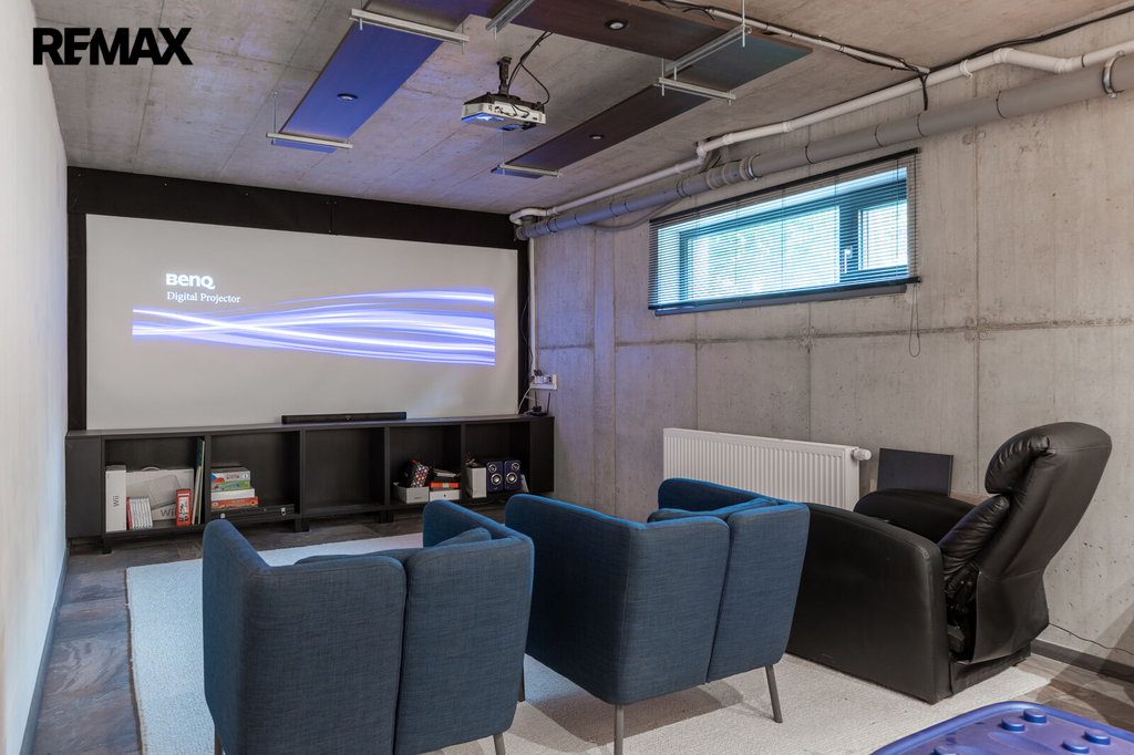 Přízemí domu tvoří garáž pro 2 vozy, tělocvična, kinosál, technické zázemí a vstup do patra po schodišti i výtahem.