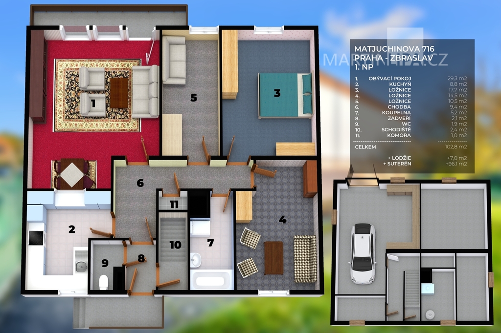 • nebo jeho horní část snadno odstranit a na původním půdorysu s využitím suterénu postavit zcela nový, moderní rodinný dům, který bude odpovídat dnešním nárokům i hodnotě lokality