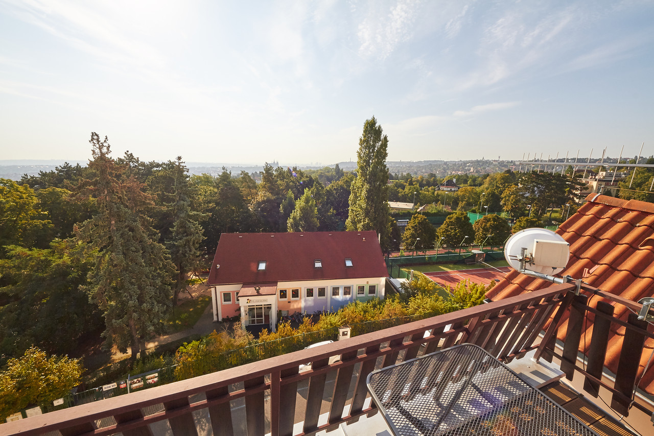 Prostorný mezonetový byt 3+kk s terasou a balkonem, v prestižní čtvrti Hanspaulka. Byt ve 3.patře bytového domu v nádherném prostředí pražské Hanspaulky. V dolním patře bytu se vpravo nalézá prostorná ložnice s dvoulůžkem, šatní skříní, klimatizací a saunou. Vpravo v chodbě vedle ložnice je prostorná komora, ve které je aktuálně umístěna sušička prádla AEG. Vlevo proti ložnici je samostatné WC a samostatná koupelna s vanou, sprchovým koutem, dvojumyvadlem a pračkou Samsung.Chodba v dolní části bytu ústí do obývací části bytu, v jejíž levé části je kuchyňský kout s plně vybavenou kuchyní s keramickou varnou deskou, digestoří, el. troubou, myčkou nádobí AEG a mikrovlnkou. Na kuchyňský kout navazuje malá jídelna s jídelním stolem a dále obývací pokoj 25m2 s klimatizací a vstupem na malý balkon.Z chodby v dolní části bytu je vstup schodištěm do patra, kde je předsíňka cca 11m2 se vstupem na terasu 9m2 s nádherným panoramatickým výhledem na Prahu. Z předsíňky vpravo je dále vstup do ložnice cca 17m2 s dvěma lůžky. Dobré dopravní spojení bus - metro A Bořislavka.