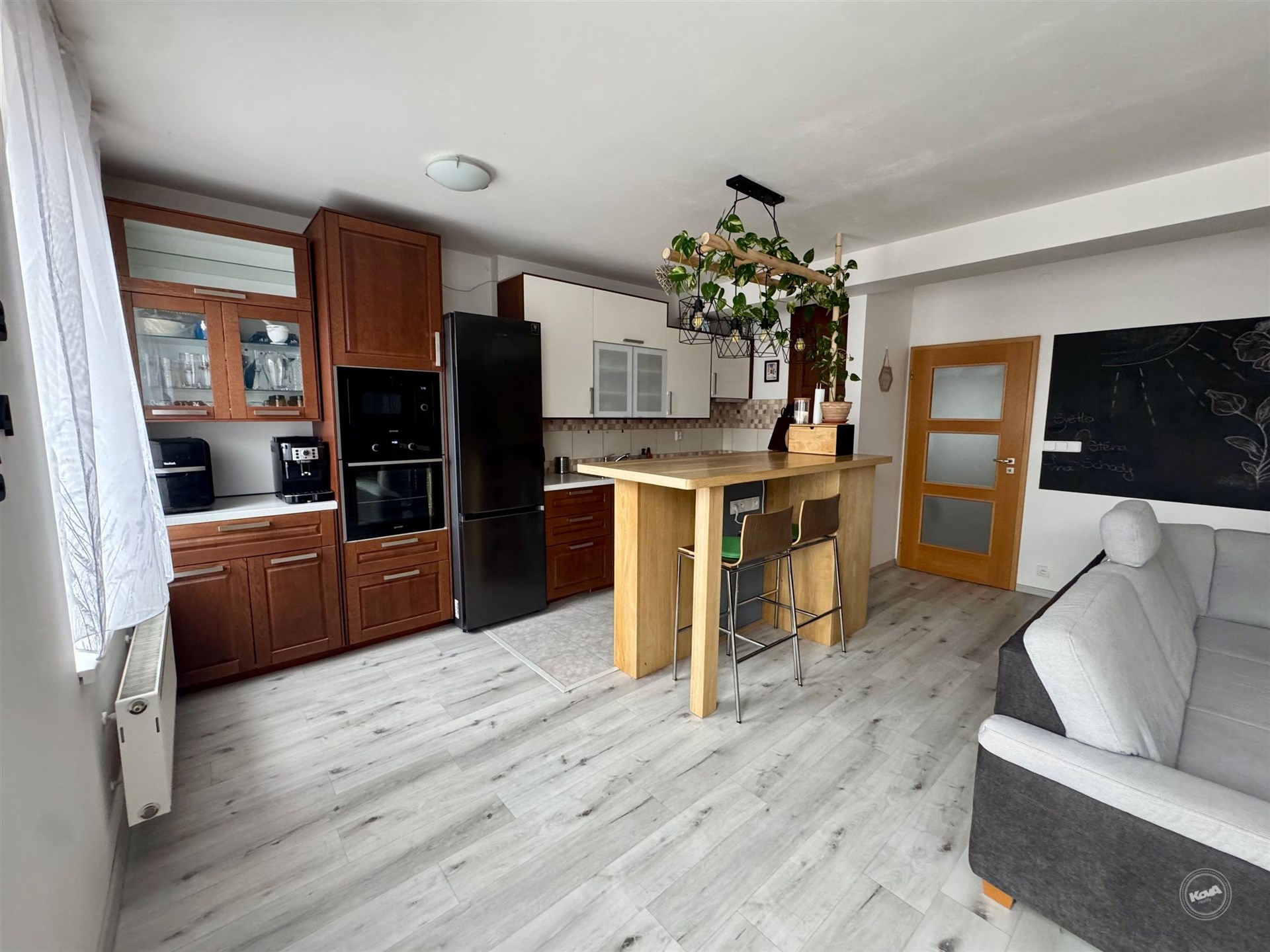 V horním patře jsou 3 samostatné pokoje, šatna a koupelna s vanou a toaletou. Ohřev teplé vody (přes léto) pomocí vlastního solárního panelu. Byt bude k nastěhovaní od 1.3.2026.