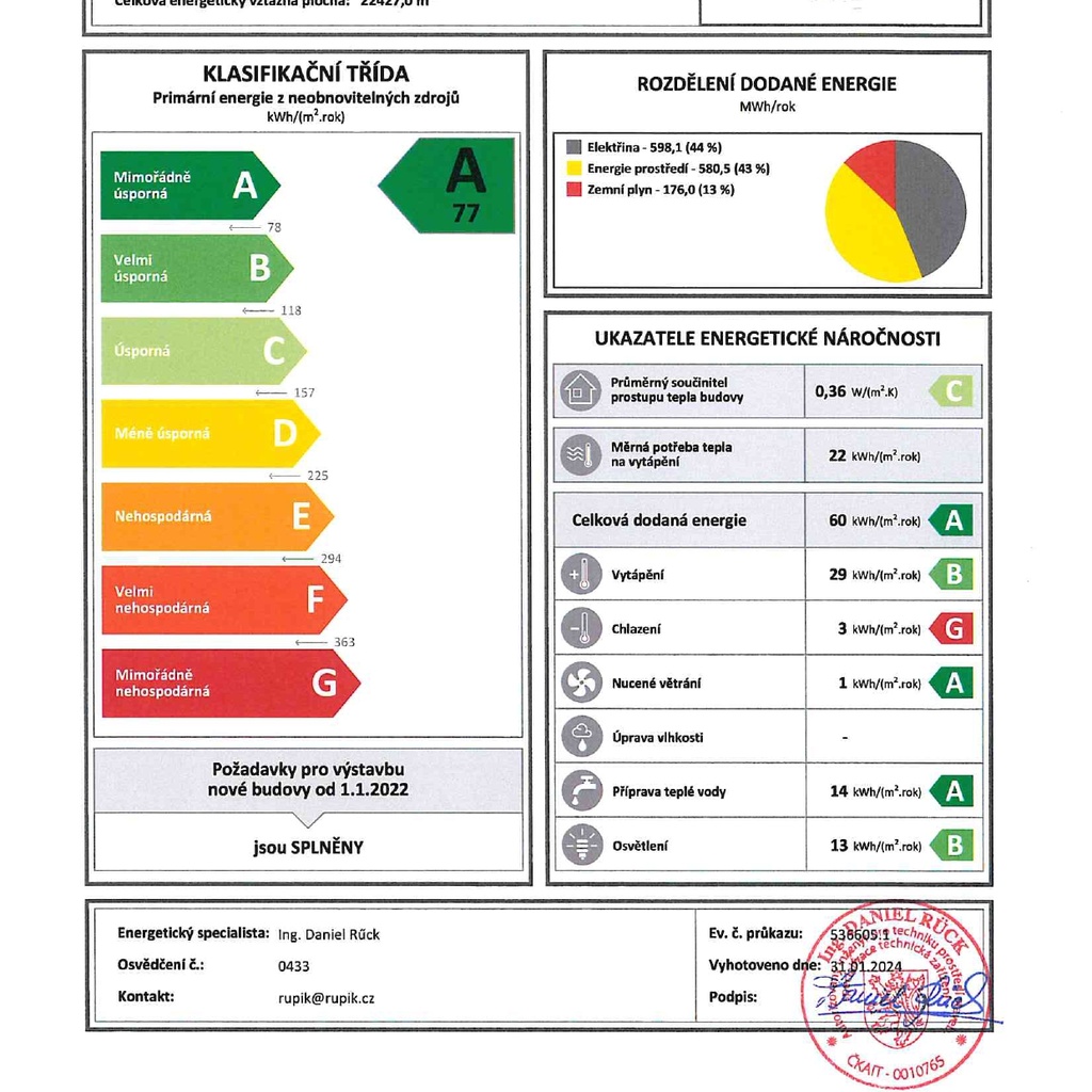 - Ukazatel energetické náročnosti budovy: 77 kWh/m²