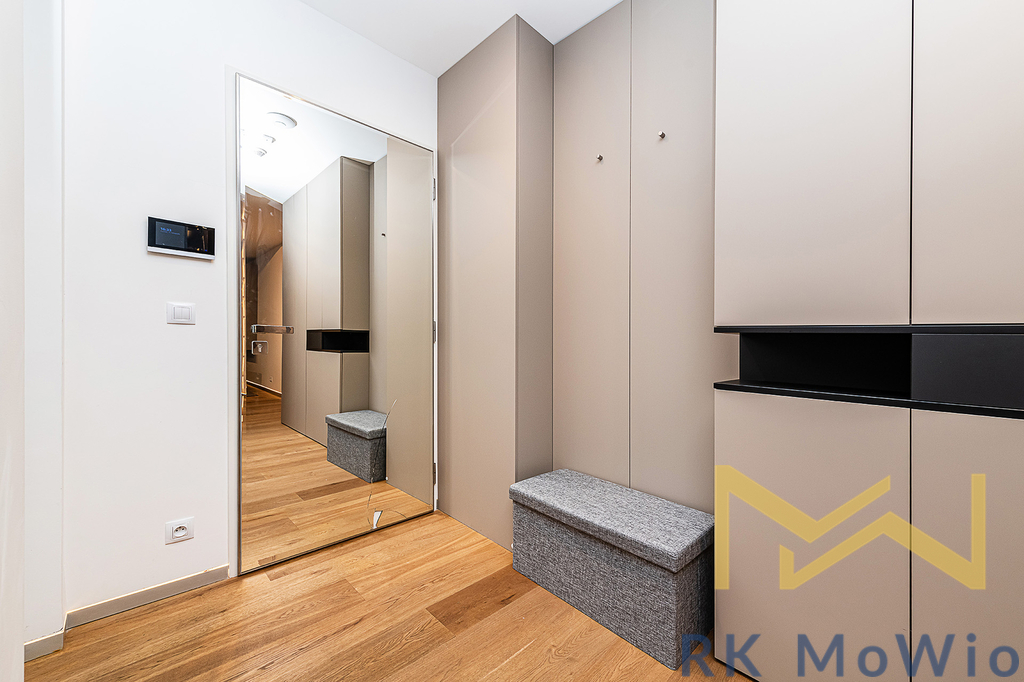 Půdorys bytové jednotky disponuje vstupní halou, obývacím pokojem, kuchyňským koutem se vstupem na lodžii, ložnicí se šatnou a vstupem na lodžii, 1 koupelnou (se sprchou, umyvadlem, toaletou, pračkou a sušičkou) . Vybavení bytu: kuchyňská linka (včetně lednice s mrazákem, sklokeramické varné desky, digestoře, myčky a elektrické trouby), vestavěné skříně, pračka a sušička, příprava pro vysokorychlostní internet. K bytu náleží parkovací stání a sklep. Foto je ilustrativní.
