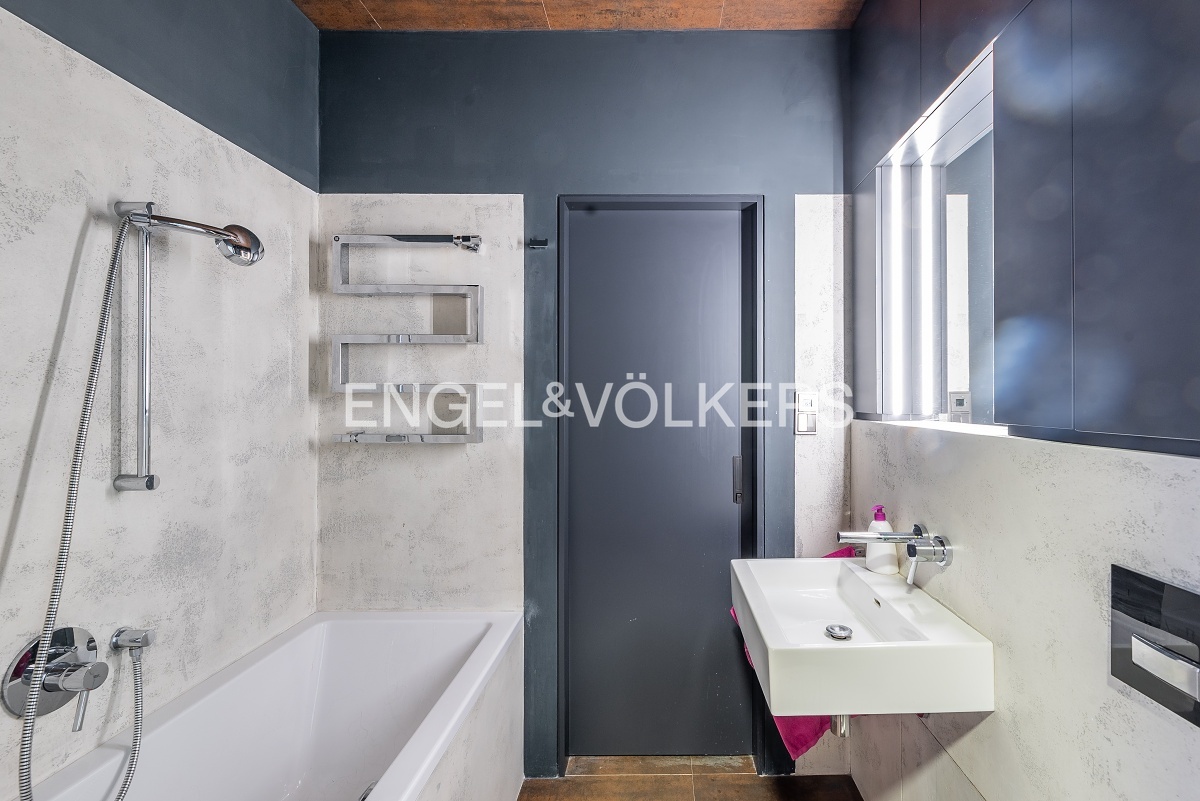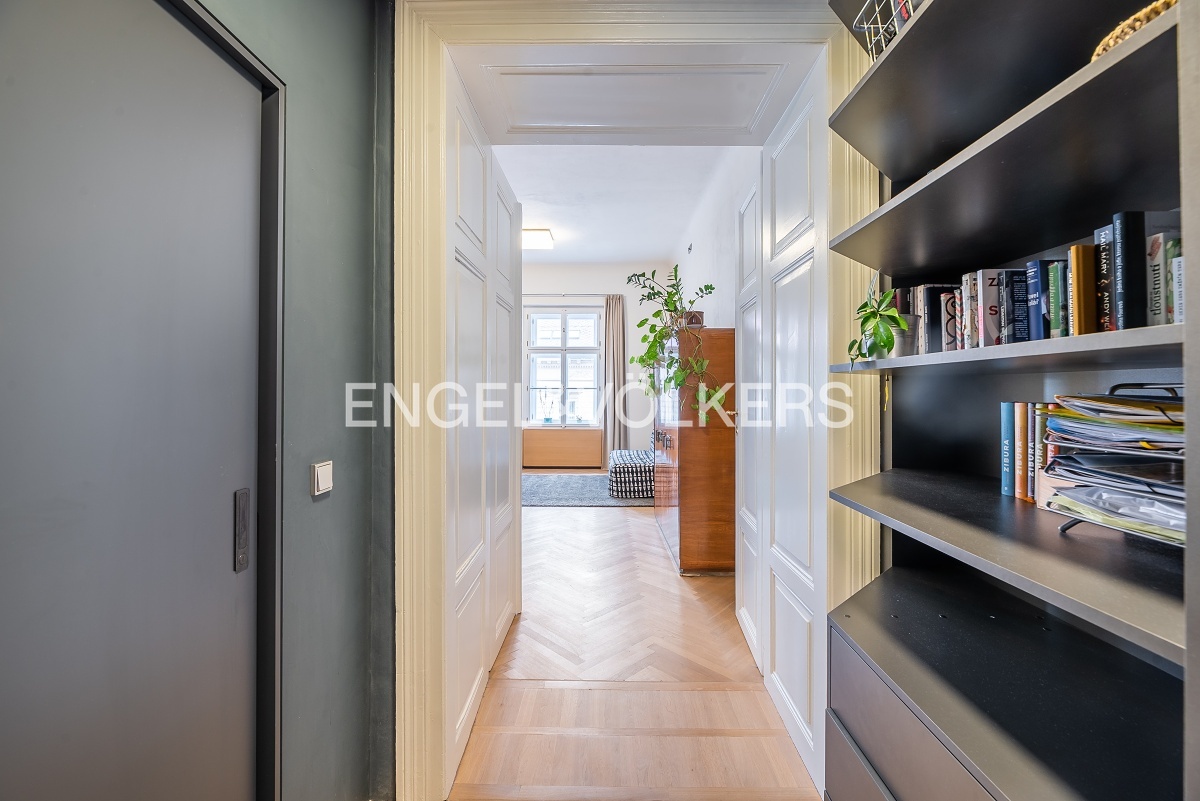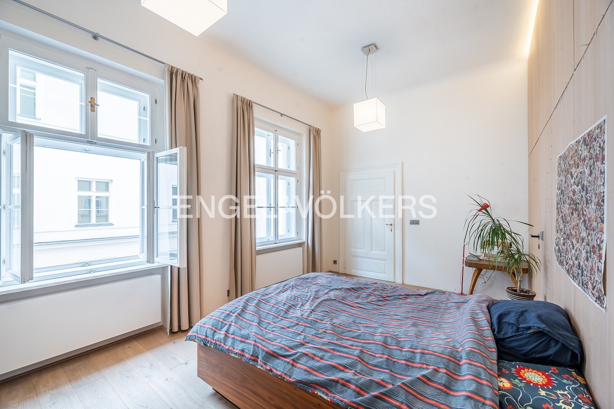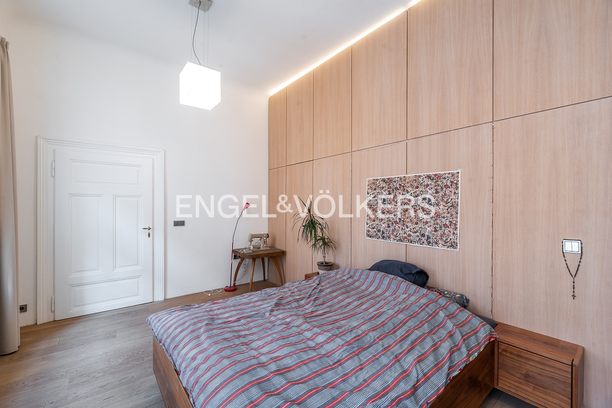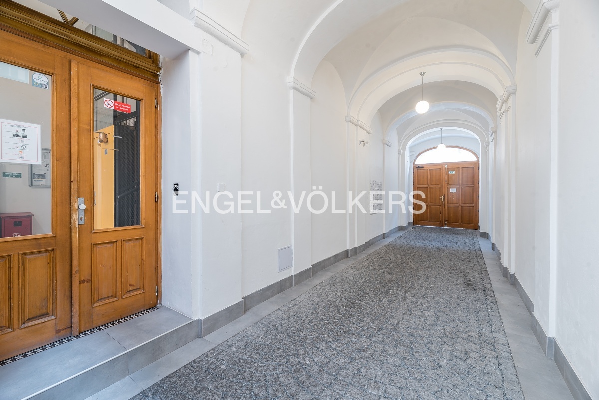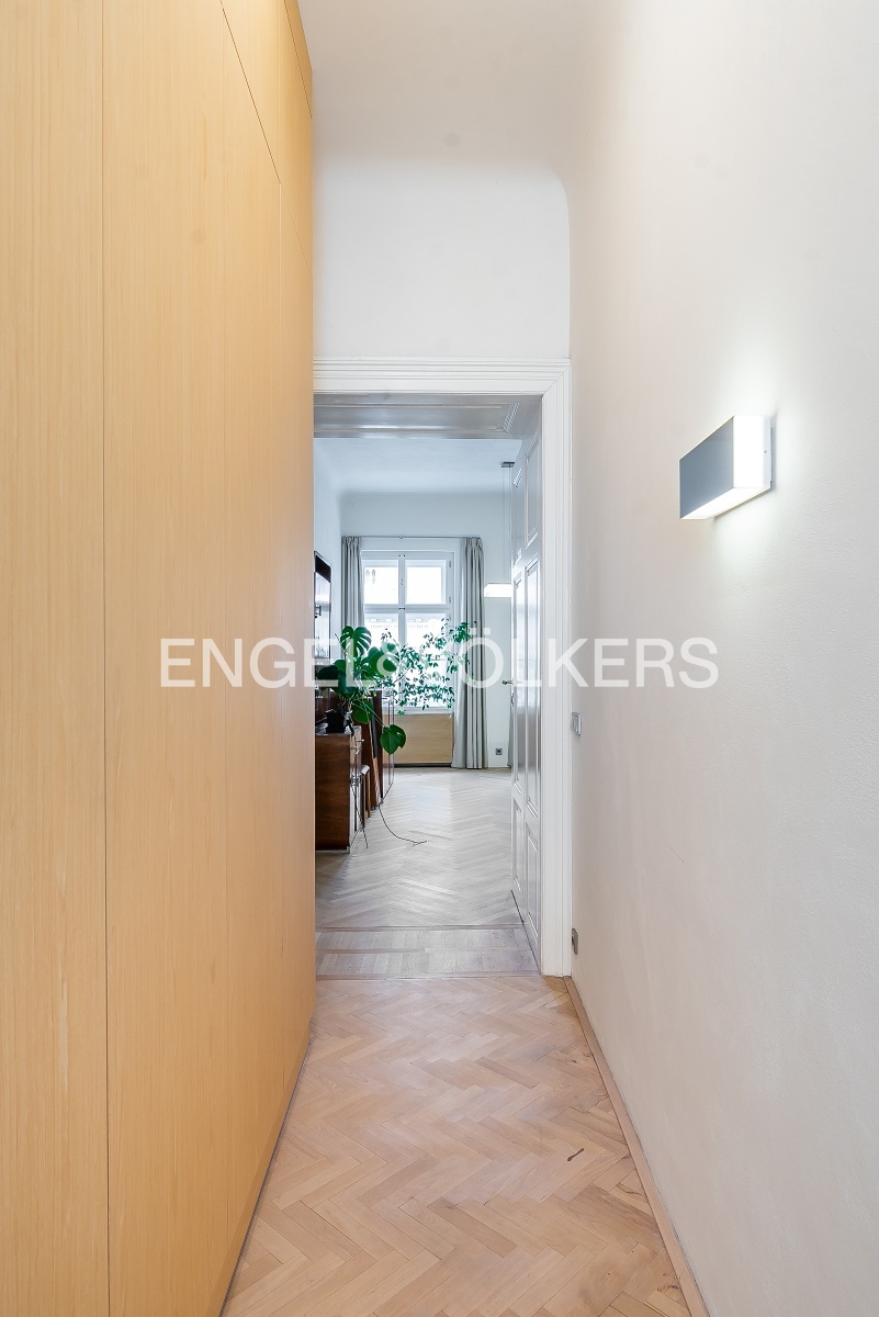 Moderně řešený byt z 19. století, který prošel před 5 lety kompletní rekonstrukcí se skládá z prostorného obývacího pokoje s plně vybavenou kuchyní s ostrůvkem a ložnice orientované do klidného dvora disponující šatnou a vlastní koupelnou s vanou. Dále se zde nachází dvě samostatné toalety a druhá koupelna vybavená sprchovým koutem. Byt je plně zařízen nábytkem a vestavěnými skříněmi. Dům disponuje výtahem.