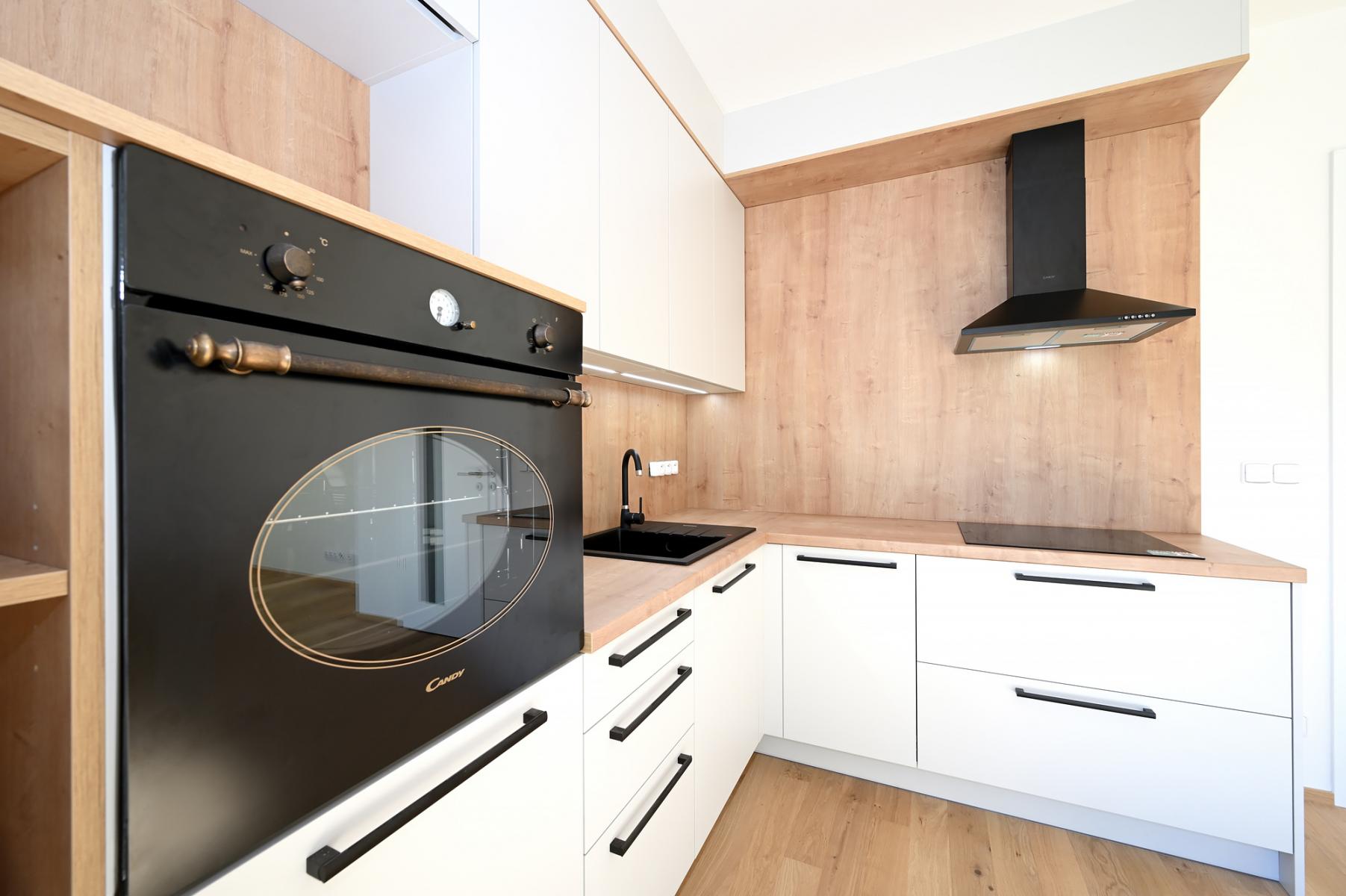 Kuchyňská linka je provedena v moderním designu v dekoru dřeva a je vybavena troubou, varnou deskou, digestoří, pračkou a myčkou nádobí. Lednice není součástí, nicméně pronajímatel je připraven ji v případě zájmu zajistit.