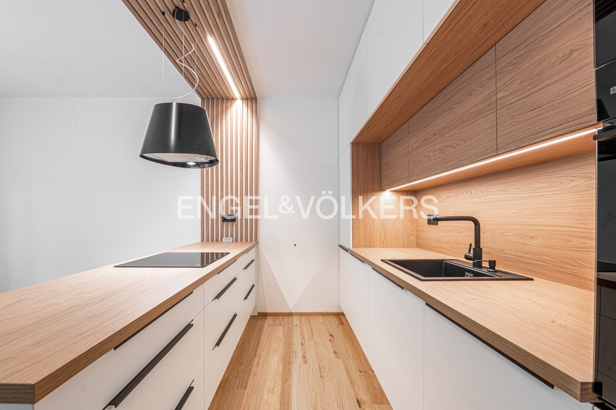 Srdcem domu je designová kuchyň na míru, která plynule přechází do obývacího pokoje a nabízí přímý vstup na zahradu přes francouzské dveře. Zahradu obklopují vzrostlé stromy, které vytvářejí přirozený stín a příjemné klima i v létě. Dále se na tomto patře nachází stylová koupelna a pracovna. Ve druhém patře se nachází hlavní ložnice s francouzskými okny a příjemným výhledem do krásné zeleně. Hlavní ložnici doplňuje druhá koupelna se sprchovým koutem a další dva pokoje.