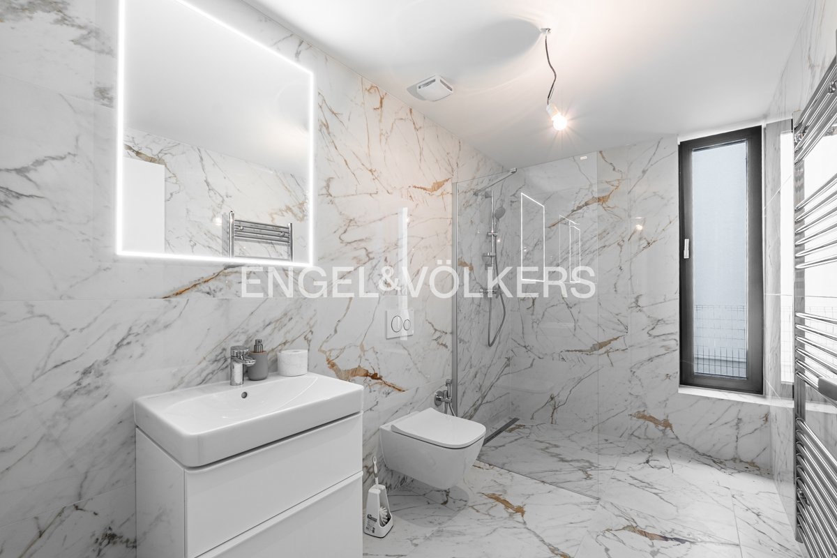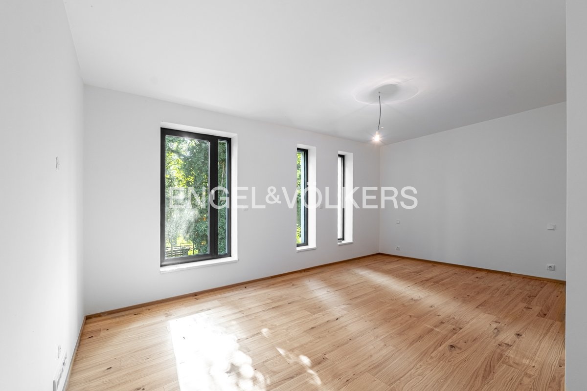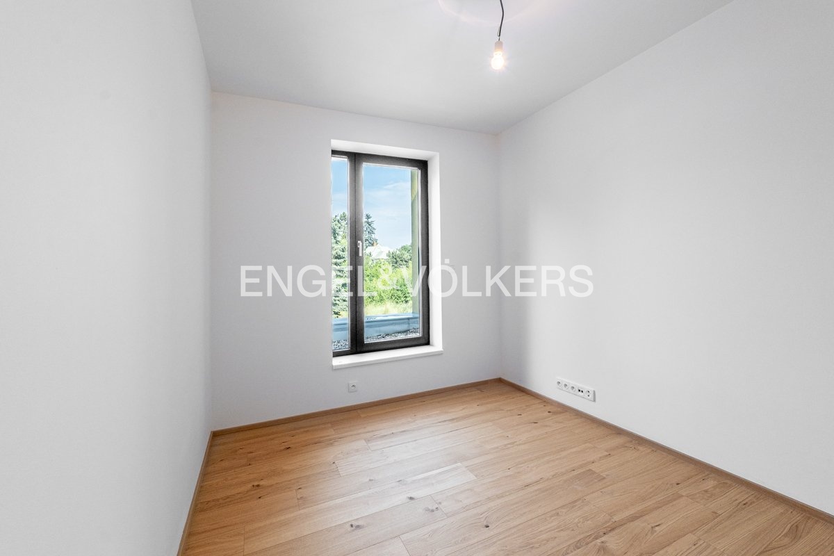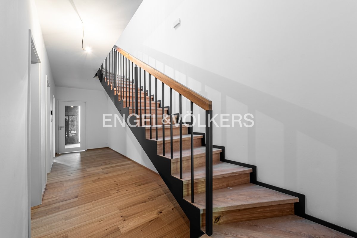 Srdcem domu je designová kuchyň na míru, která plynule přechází do obývacího pokoje a nabízí přímý vstup na zahradu přes francouzské dveře. Zahradu obklopují vzrostlé stromy, které vytvářejí přirozený stín a příjemné klima i v létě. Dále se na tomto patře nachází stylová koupelna a pracovna. Ve druhém patře se nachází hlavní ložnice s francouzskými okny a příjemným výhledem do krásné zeleně. Hlavní ložnici doplňuje druhá koupelna se sprchovým koutem a další dva pokoje.