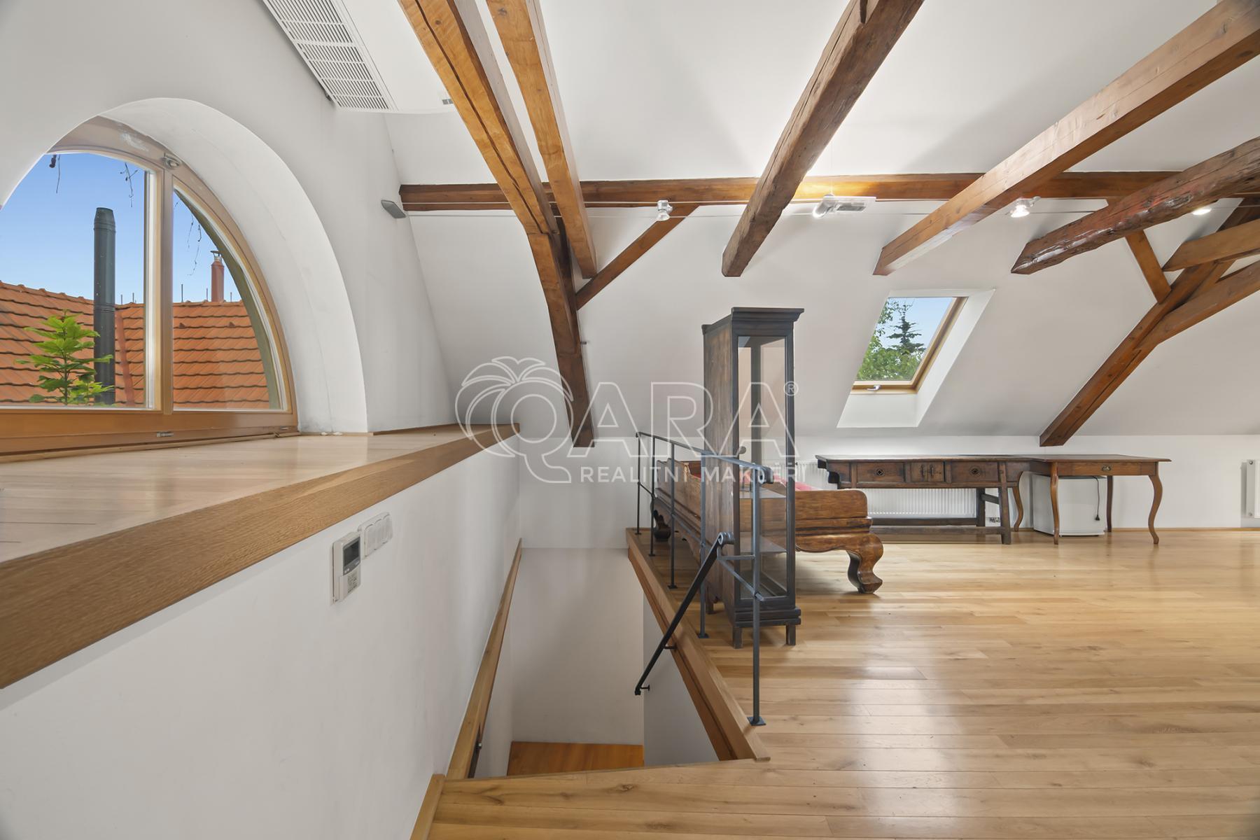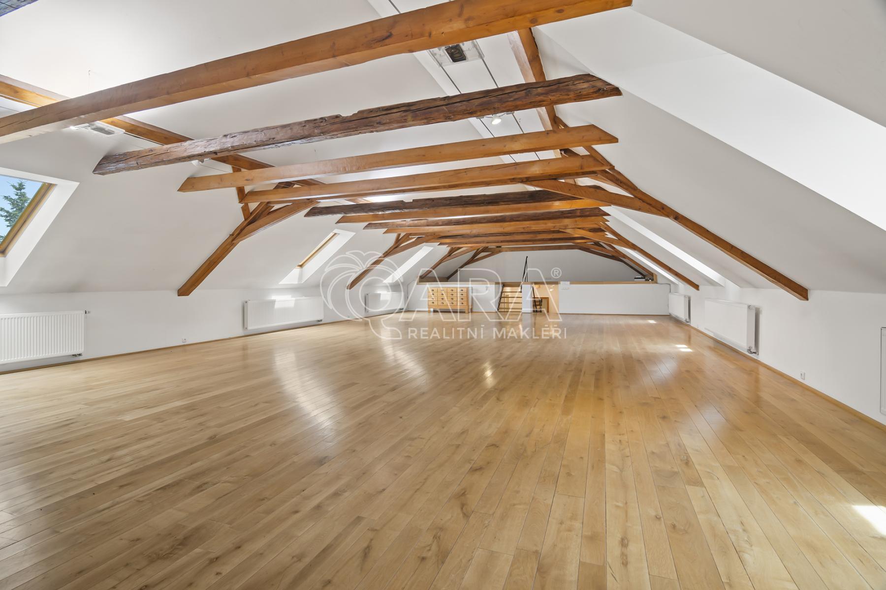 Celková podlahová plocha činí 469,5 m2 ve dvou podlažích. Přízemí o velikosti 221 m2 je řešeno jako skladový prostor s možností přímého vjezdu, zatímco horní podlaží o výměře 248,5 m2 tvoří otevřený a reprezentativní prostor vhodný pro showroom, kanceláře nebo ateliér. Díky konstrukčnímu řešení krovu bez podpěrných sloupů je prostor maximálně variabilní a vzdušný.