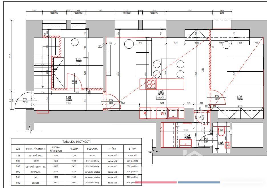 V přízemí se nachází dvě veliké místnosti, k první z nich přiléhá toaleta s komorou, kde se dá zřídit sprcha či kuchyňka nebo šatna, druhá místnost má pak samostatný vstup do jednotky, kde se nachází schodiště vedoucí do dalších místností v 1.PP.
