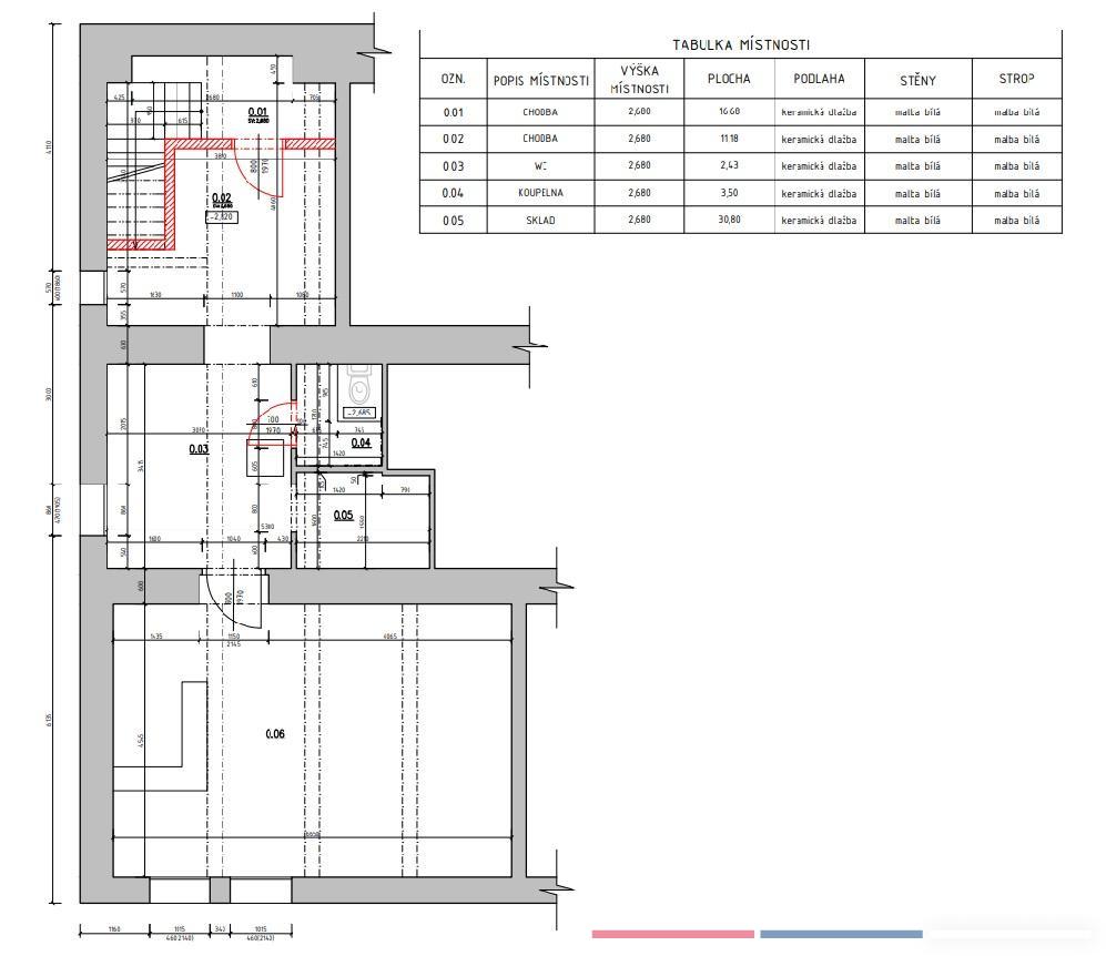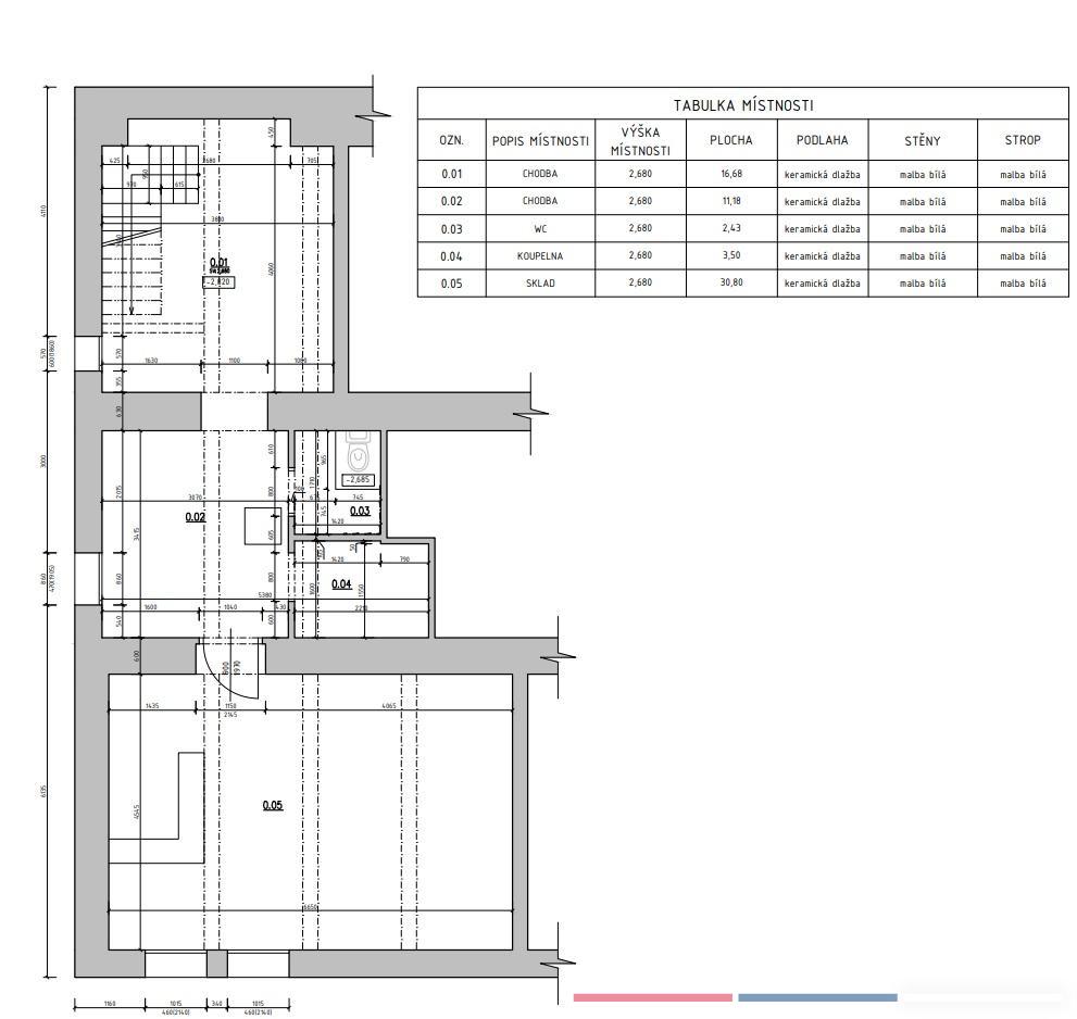 Zde nalezneme prostornou vstupní místnost, širší chodbu se samostatným WC a technickou místnosti, a dále se dostaneme do největšího dolního prostoru o velikosti 30 m2 s okny vedoucími do dvora na parkoviště, okna jsou umístěna v tzv. aglickém dvorku.