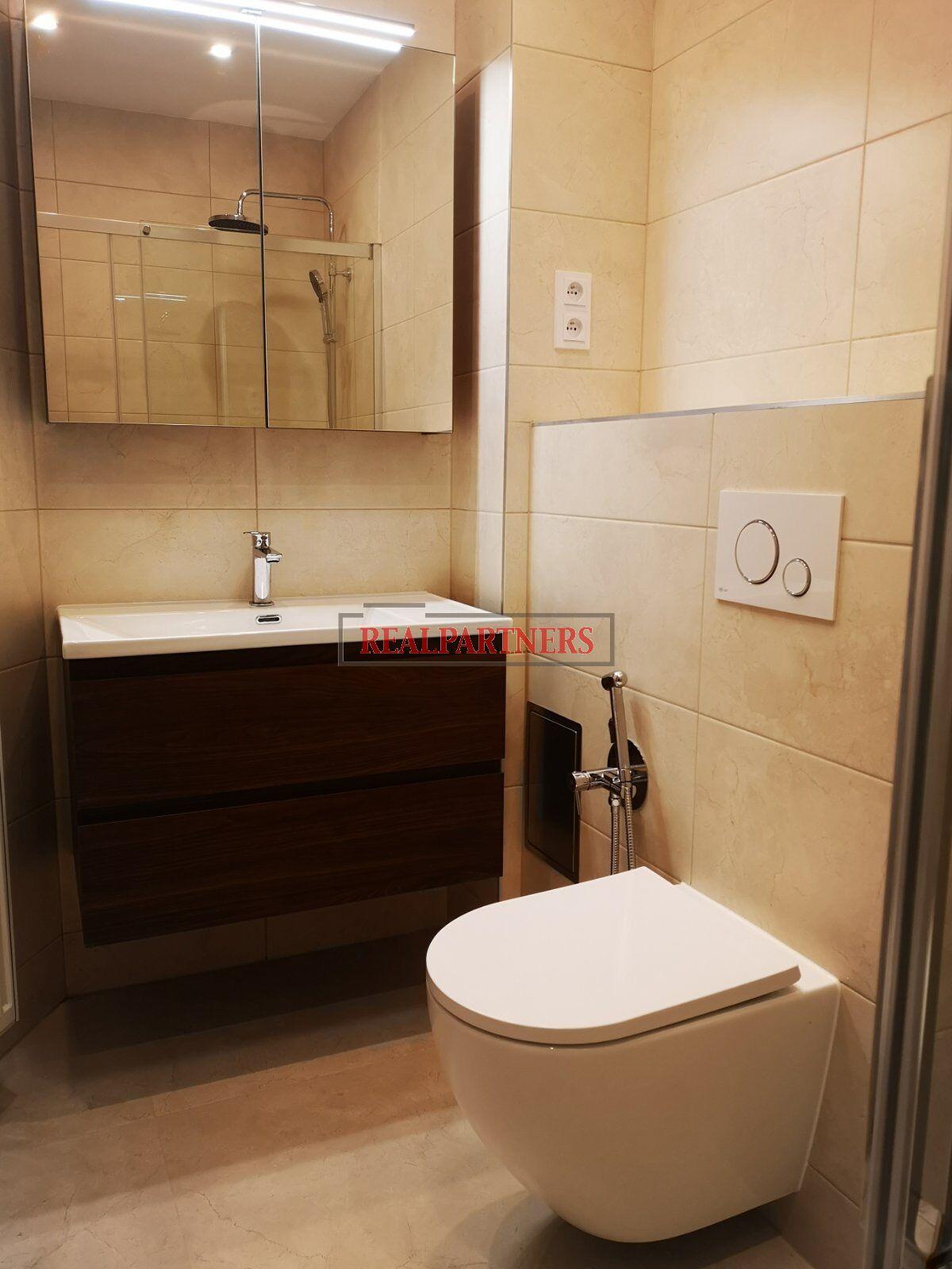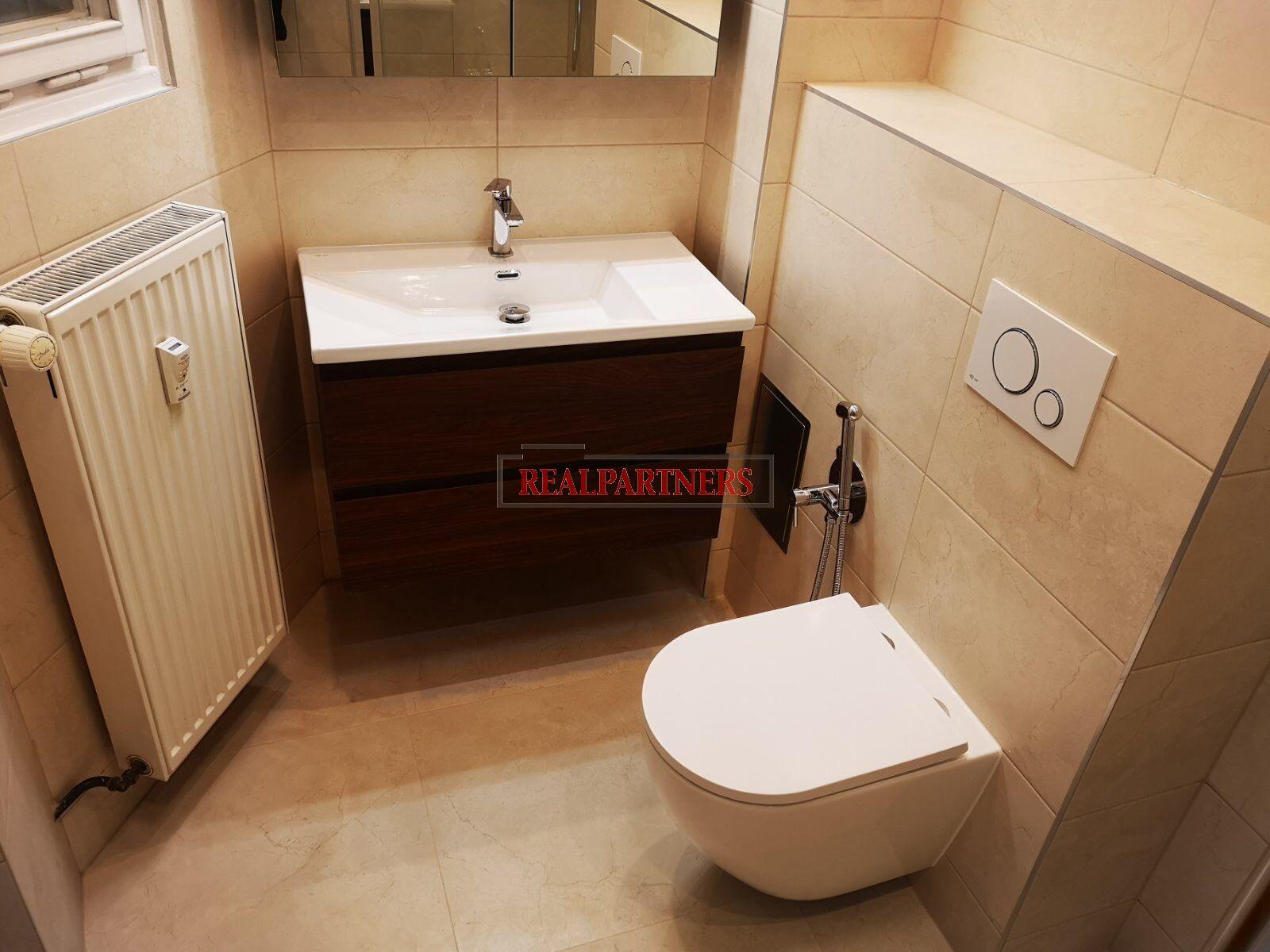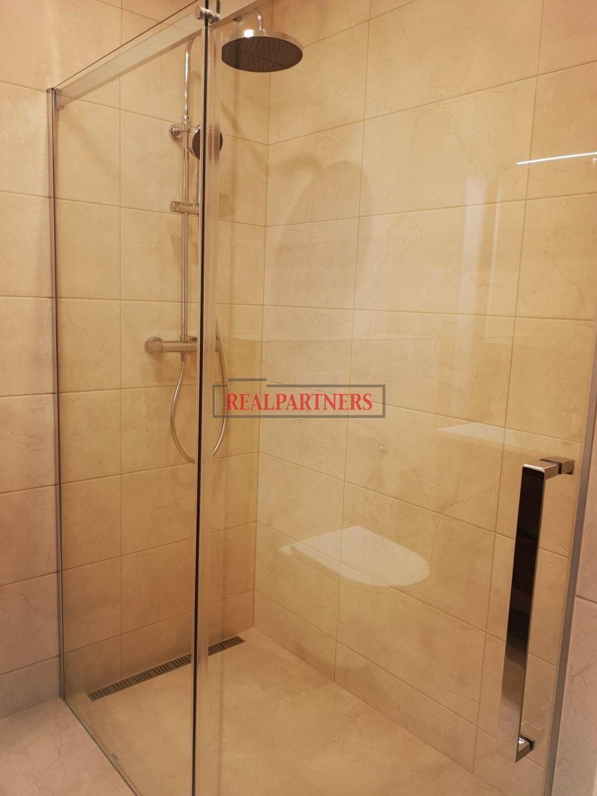 Byt se skládá z velkých průchozích pokojů, nejmenší plochu zabírá pracovna za kuchyni, a kompletně nové, moderní zděné koupelní se sprchovým koutem, bidetem a toaletou, v chodbě je ještě jedna toaleta žvást. Také je k dispozici sklep o ploše 6 m².