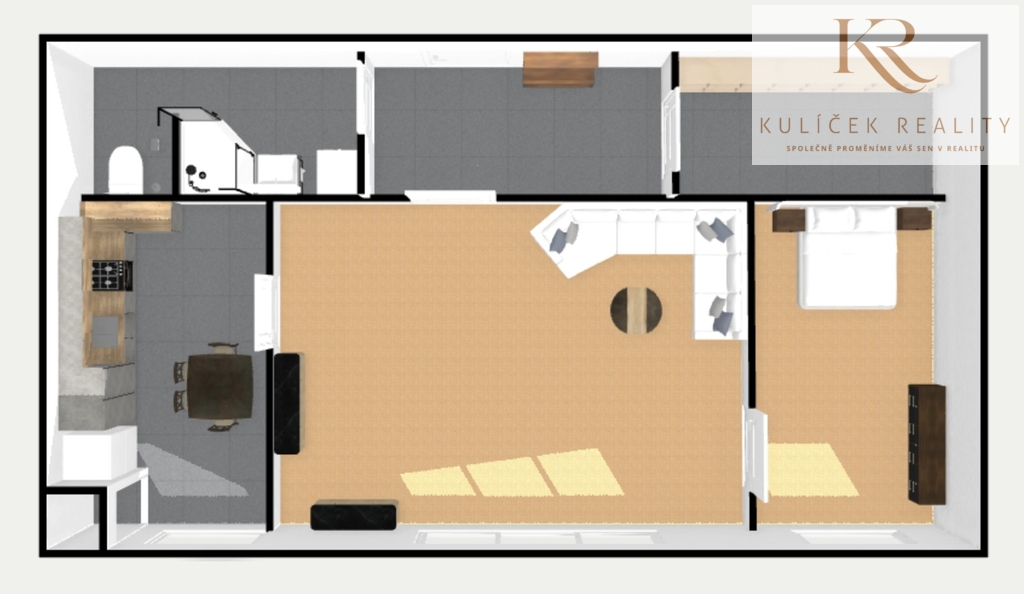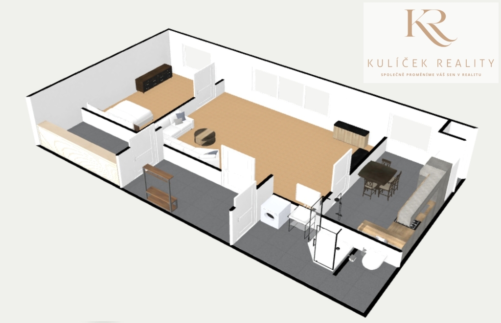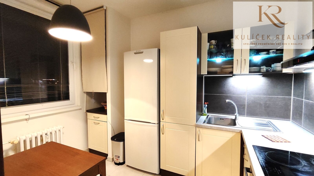 Byt je v osobním vlastnictví po kompletní rekonstrukci – má nové podlahové krytiny, keramickou dlažbu, koberce a moderní keramickou varnou desku. Nachází se zde samostatná koupelna se sprchovým koutem, umyvadlem, WC a přípravou na pračku. V předsíni je také praktická komora. Dispozici bytu tvoří samostatná ložnice a obývací pokoj propojený s kuchyní a předsíní.