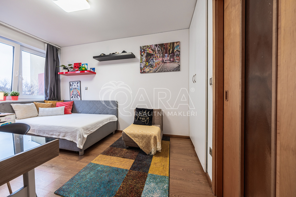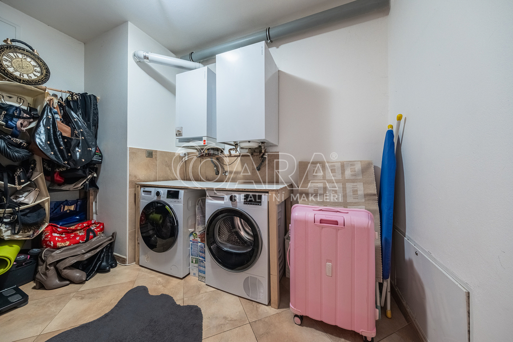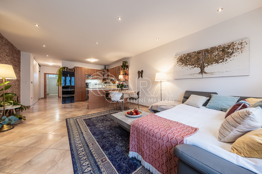 Dominantou příjemného bydlení je prostorný obývací pokoj propojený s kuchyňským koutem. Obývací pokoj dále navazuje na samostatný "studentský" pokoj s vlastní koupelnou s rohovou vanou a toaletou. Komfort výjimečného bytu doplňuje podlahové vytápění, které je v celém bytě včetně garáže. Každou hospodyňku pak stoprocentně potěší technická místnost spojená s prádelnou, sušárnou a umně skrytými úložnými prostory.
