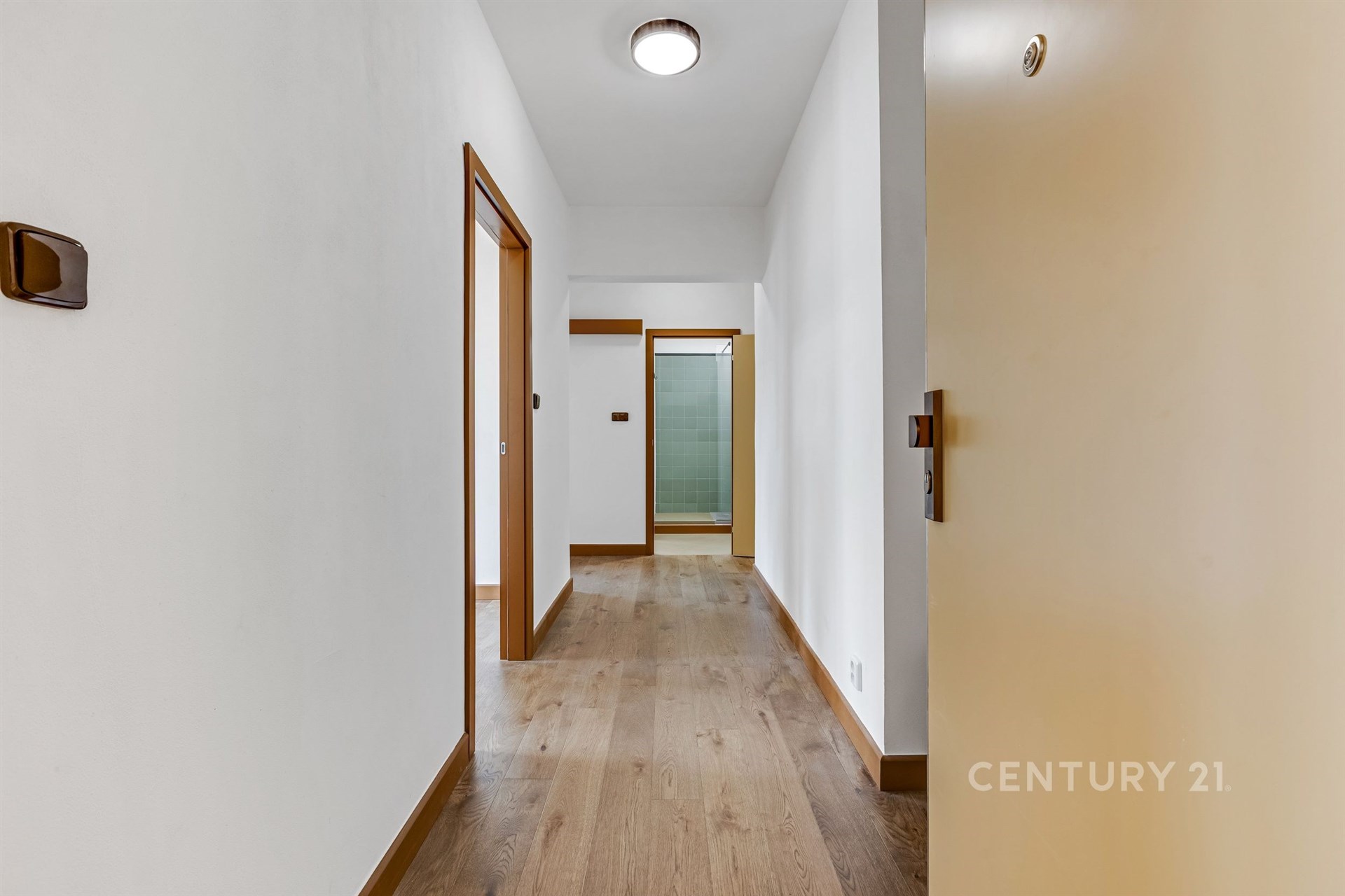 Byt dále nabízí bezfalcové interiérové dveře, moderní koupelnu s designovou epoxidovou stěrkou a nové bezpečnostní vstupní dveře třídy RC3.