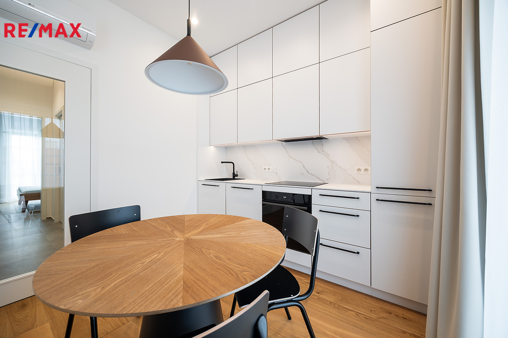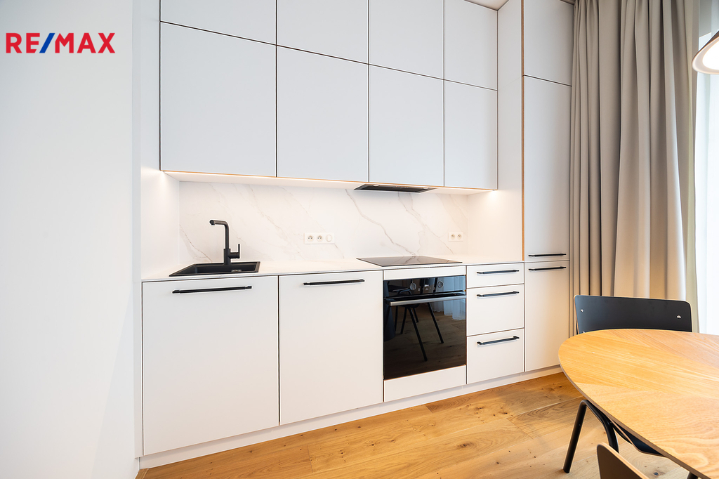 Interiér je navržený na míru a kompletně zařízený kvalitním nábytkem i spotřebiči. Obývací pokoj s kuchyňským koutem je díky francouzskému oknu velmi světlý, stejně tak i ložnice a s obou pokojů je vstup na terasu (vnitroblok ložnice, obývací pokoj ulice). Kuchyňská linka je plně vybavená vestavěnými spotřebiči.