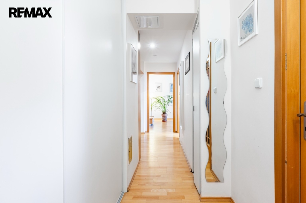 Interiér bytu je v nadstandardním provedení – dřevěné podlahy, podlahové vytápění v koupelně, bezpečnostní vstupní dveře s videotelefonem, interiérové dřevěné dveře značky Sapeli, vestavěné skříně a praktické úložné prostory. Kuchyňská linka je vybavena veškerými spotřebiči.
