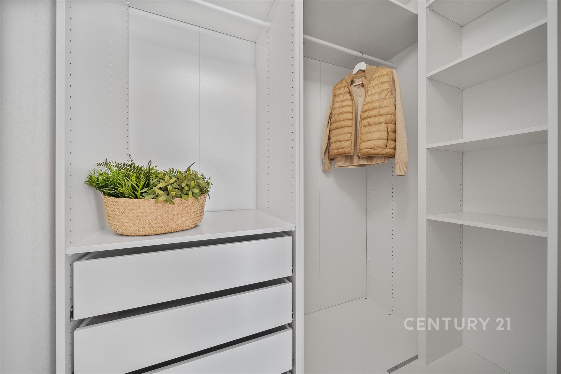Velkou výhodou je samostatná šatna vybavená policemi a zásuvkami, která řeší úložné prostory prakticky a bez kompromisů – bez nutnosti zaplňovat obytné místnosti skříněmi.