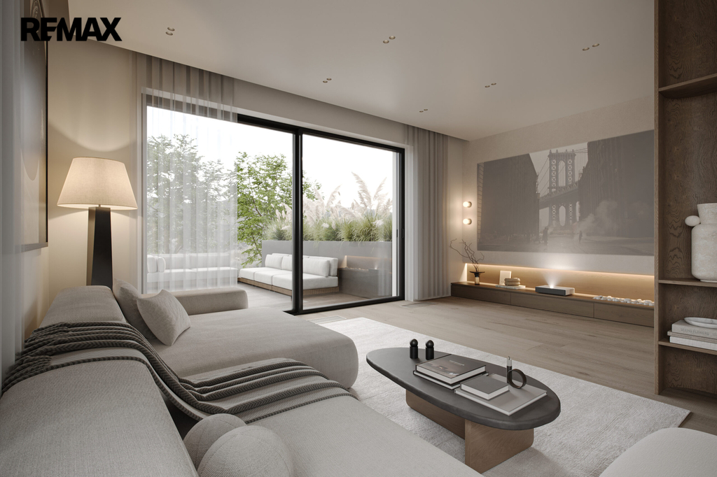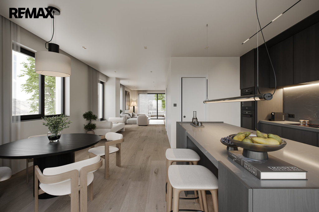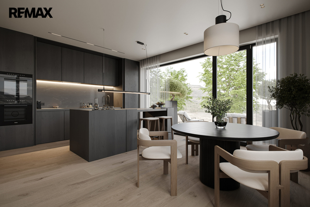1. podlaží: Obývací pokoj, kuchyně a jídelna (60 m²) s výstupem na balkon a terasu (25 m²). Spižárna a samostatné WC.