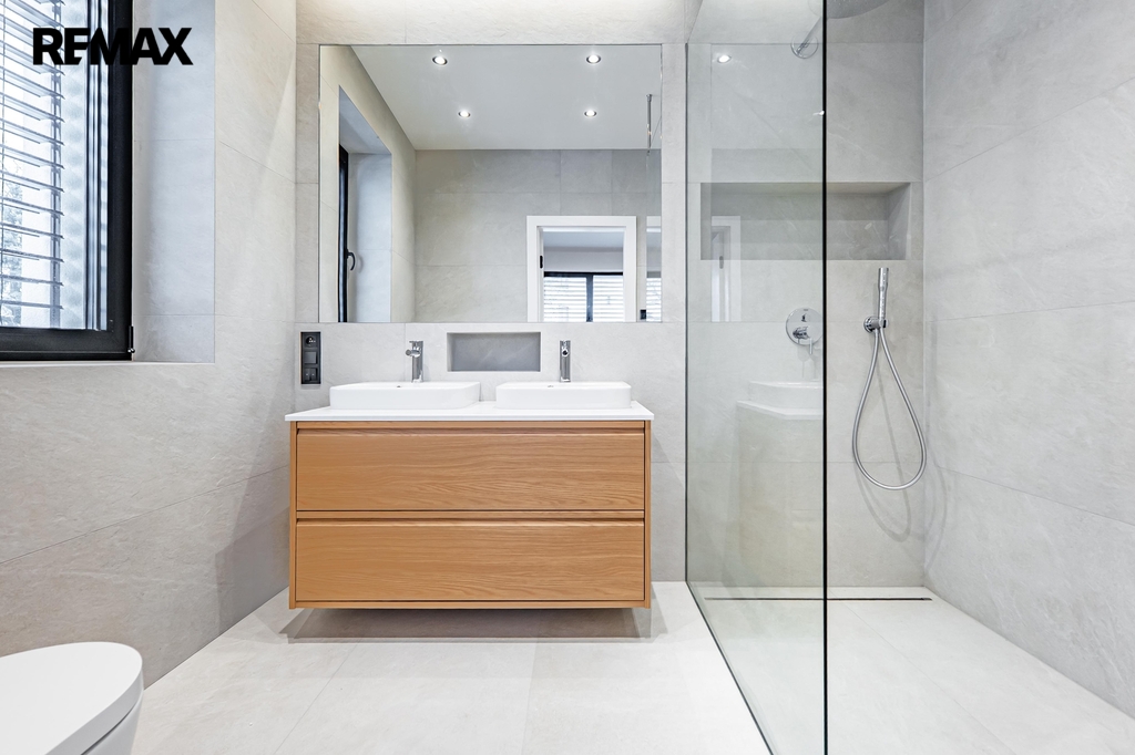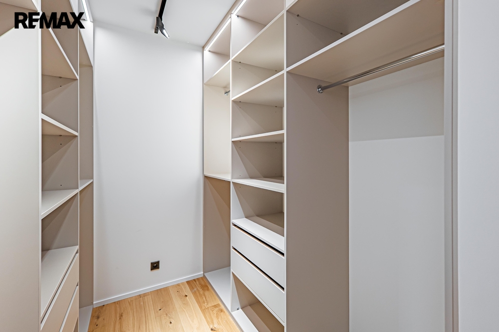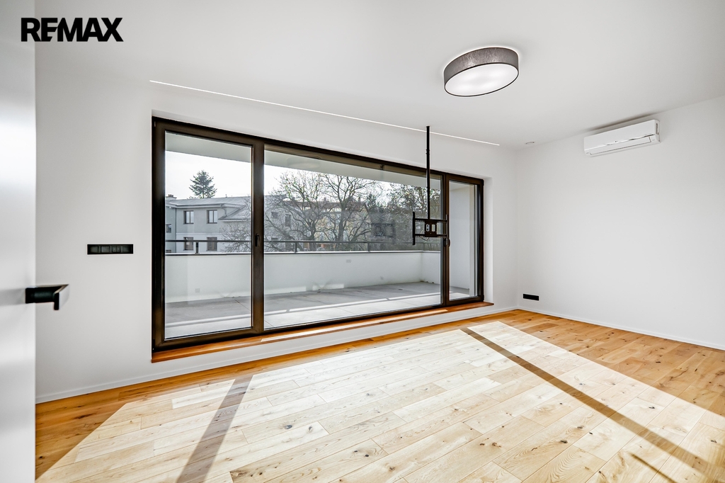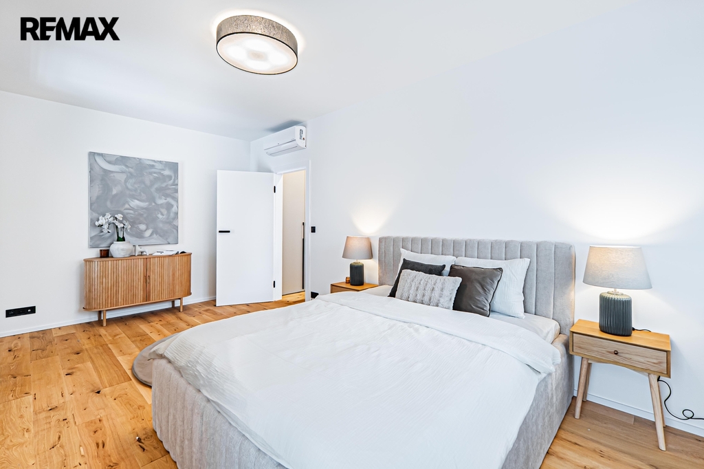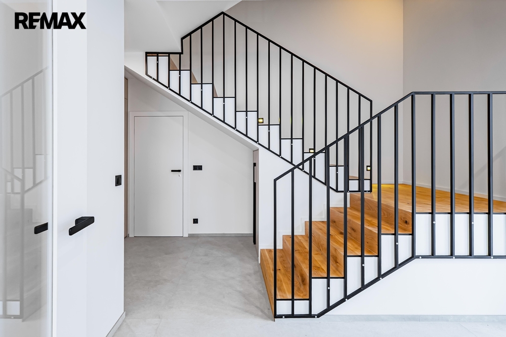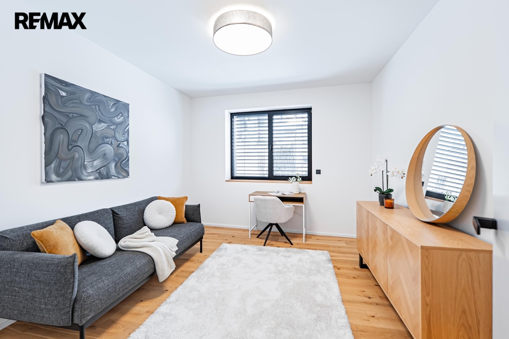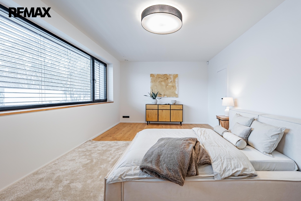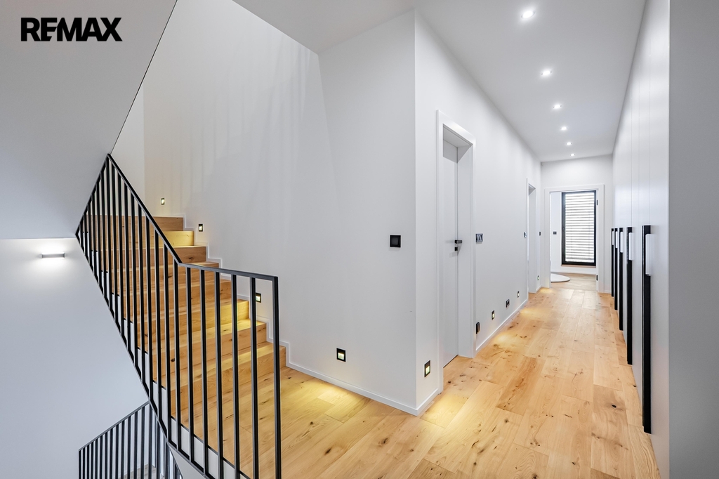Dřevěné podlahy a podlahové vytápění přispívají k příjemné atmosféře, zatímco lakované bezfalcové dveře s magnetickými zámky podtrhují celkový design interiéru. V celém domě jsou hliníková okna s trojskly zajišťující výbornou tepelnou izolaci a všechna okna jsou vybavena předokenními žaluziemi.