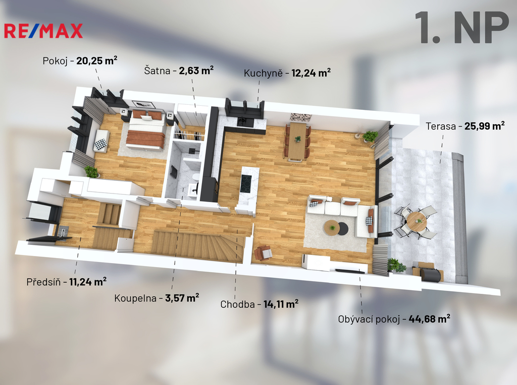 • Přízemí: prostorný obývací pokoj s přímým vstupem na terasu, kuchyňský kout, pracovna (nebo pokoj pro hosty), koupelna, vstupní chodba, šatna