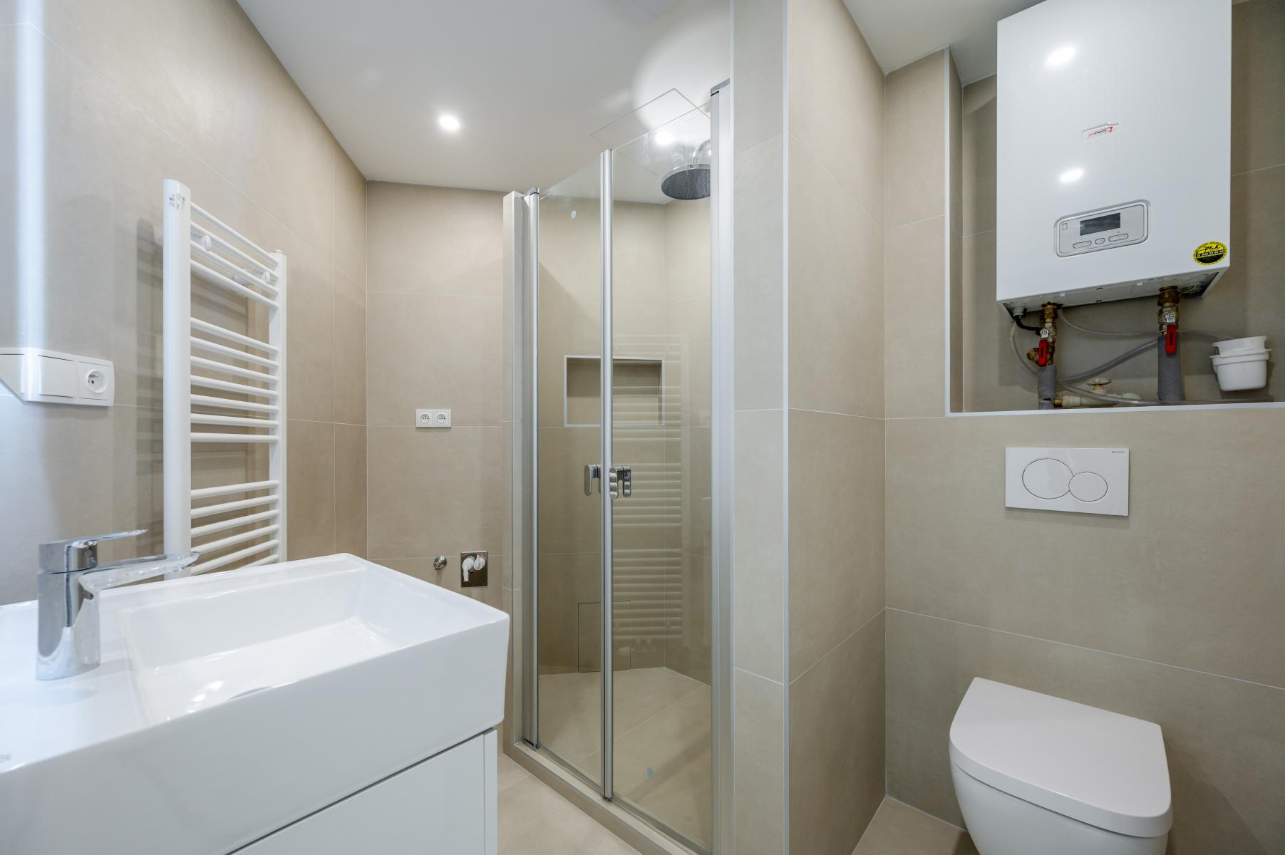 Dům i byt jsou v perfektním stavu, po kompletní rekonstrukci. Byt naleznete ve 2. patře a po vstupu se před vámi otevře velkoryse řešený interiér s prostornými místnostmi, vysokými stropy a velkými okny. Skládá se z chodby, obývacího pokoje, kuchyně, komory, ložnice a koupelny (se sprchovým koutem, umyvadlem, toaletou, přípojkou na pračku a sušičku). Kuchyňská linka má velkou pracovní plochu, je vybavena vestavěnou pečící troubou, mikrovlnnou troubou, indukční varnou deskou, digestoří a myčkou. Vytápění zajišťuje vlastní elektrický kotel. Okna směřují do tichého vnitrobloku a klidné jednosměrné ulice. K bytu náleží velký sklep.