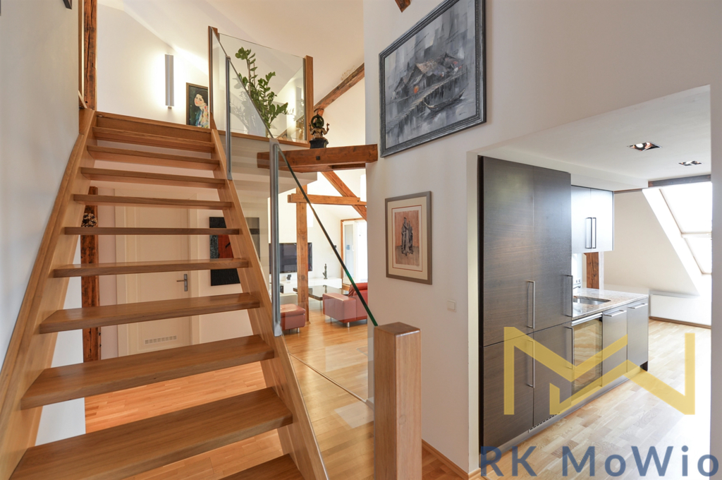 K pronájmu nabízíme luxusní, zařízený (v případě, že by klient chtěl, může být byt nezařízený) půdní mezonetový byt se zachovalými dřevěnými trámy, o dispozici 5+kk o podlahové ploše 210 m2 s terasou o rozloze 10 m2, situovaný v 4. patře (5. nadzemní podlaží) citlivě zrekonstruované, impozantní historické budovy rezidence Charlotte s výtahem, v ulici Jana Masaryka v reprezentativní rezidenční lokalitě Prahy 2 - Vinohrady.