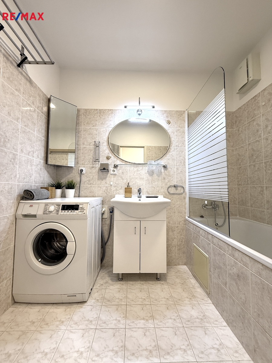 Koupelna – vana, umyvadlo s koupelnovou skříňkou, pračka, otopný žebřík