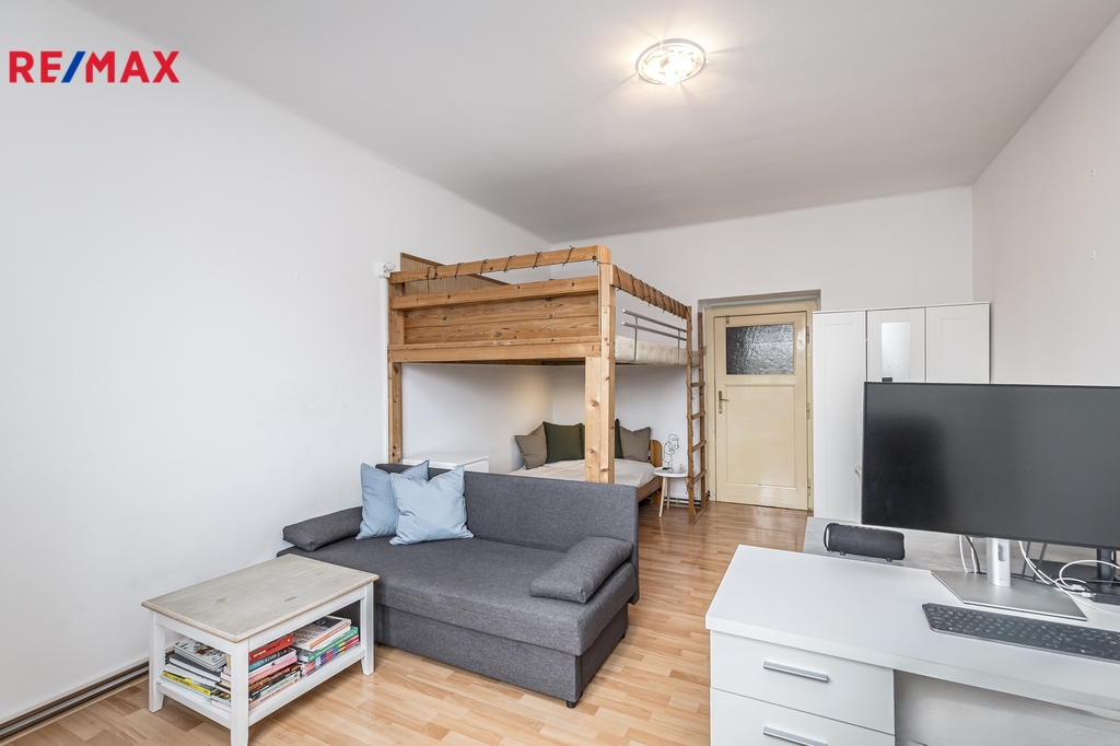 Interiér bytu se vyznačuje vysokými stropy, které zajišťují prostorný a vzdušný pocit. Byt má sice původní vnitřní dveře, ale nová podlaha a čerstvá výmalba dodávají bytu na útulnosti. Díky spacímu patru je možné efektivně využít prostor a vytvořit tak příjemné zázemí. Byt se oproti fotkám a vizualizaci pronajímá jen částečně zařízený, součástí nájmu je spací patro, vybavená kuchyňská linka (plynový sporák, dřez, lednice s mrazákem, digestoř) a pračka v koupelně.