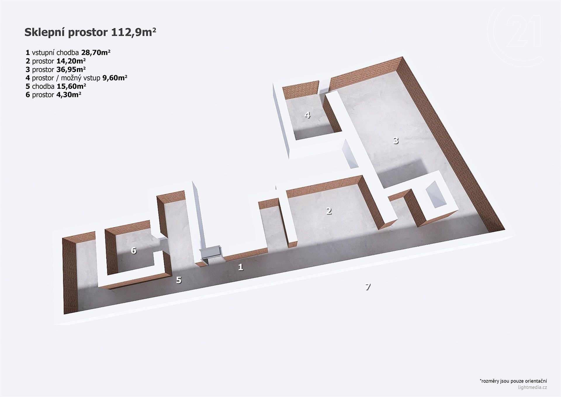 Sklepní prostory jsou v původním stavu, připravené k rekonstrukci. Světlo sem proniká světlíky, hlavní vstup vede z přízemí domu ve dvorním traktu a nabízí se i možnost zřízení druhého samostatného vstupu. To vše s připojením na elektřinu, vodu, kanalizaci a možností zavedení plynu.