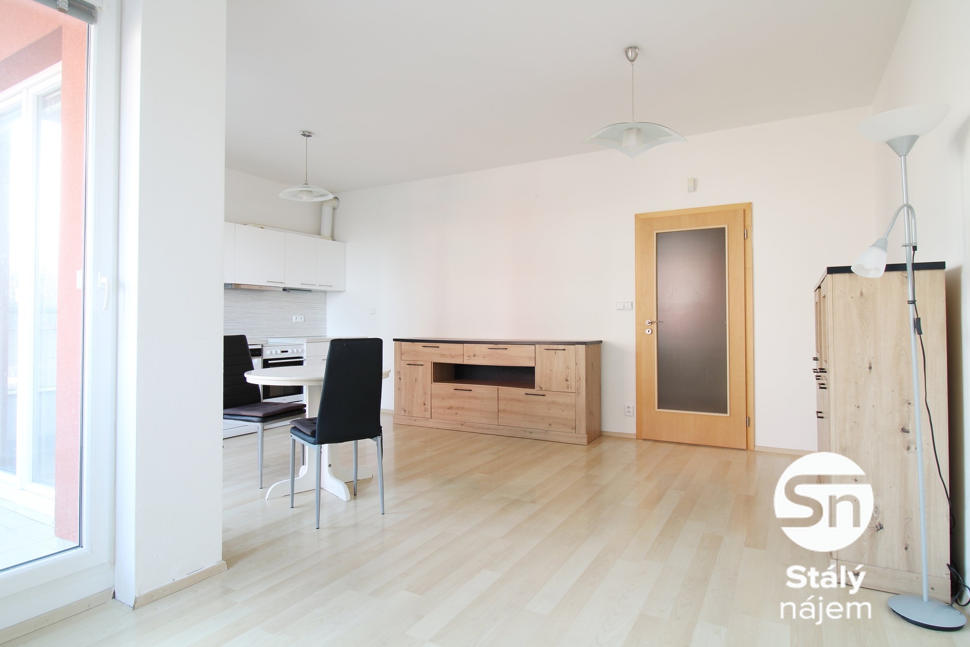 Obývací pokoj je spojený s kuchyní, která je zařízená kuchyňskou linkou se spotřebiči, jako jsou elektrický sporák, lednice s mrazákem, myčka a digestoř. Dále zde naleznete jídelní stůl se židlemi a komodu. Obývací část je vybavena komodou a je z ní vstup na balkon. V další místnosti je policová skříňka, jinak je tato místnost nezařízená a můžete si z ní udělat relaxační místnost. Koupelna disponuje vanou, umyvadlem, závěsnou skříňkou a pračkou. Toaleta je součástí koupelny. Prostorná chodba je nezařízená, ale nabízí dostatek místa na věšákovou skříň.