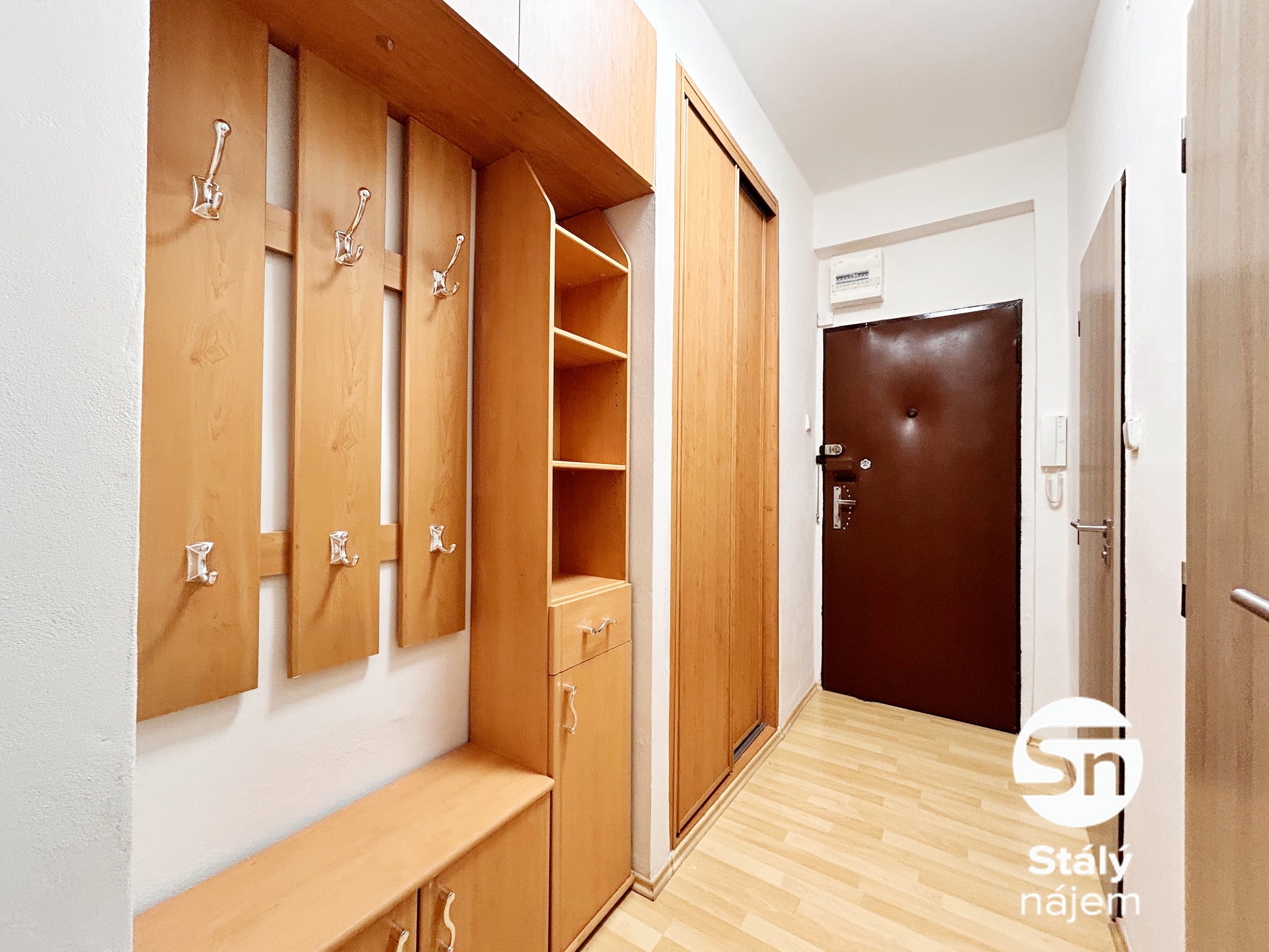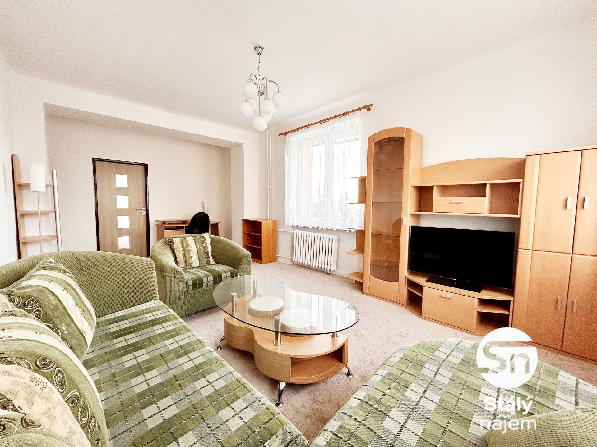 V obývacím pokoji a ložnici jsou nové koberce. Obývací pokoj je vybaven rozkládacím gaučem s úložným prostorem, křeslem, konferenčním stolkem s taburetkami, televizí, obývací stěnou, policovým dílem, PC stolem a kolečkovou židlí. V chodbě se nachází vestavěná skříň, věšáková sestava, zrcadlo a funkční domovní telefon.