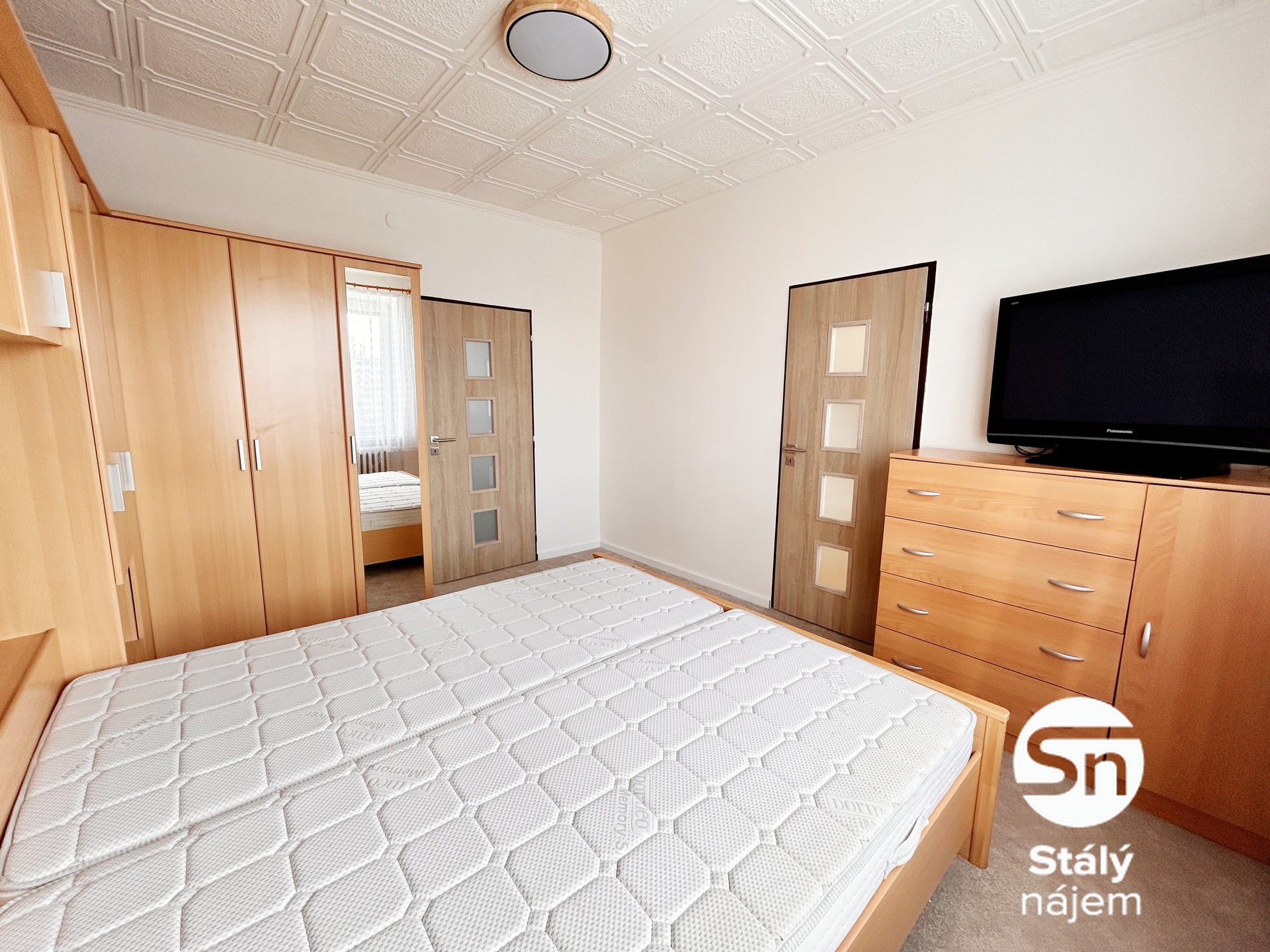 Ložnice je vybavena postelí se dvěma matracemi, rohovou ložnicovou sestavou, prádelníkem, solnou lampou a televizí s ovladačem. Moderní stropní svítidlo umožňuje nastavení intenzity i barvy světla.