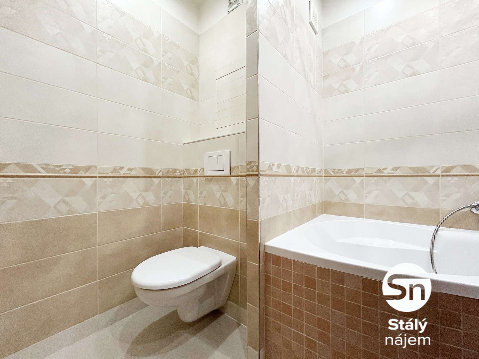 Koupelna je spojena s toaletou a je zde vana, umyvadlo se skříňkou, osvětlené zrcadlo, pračka a odvětrání.