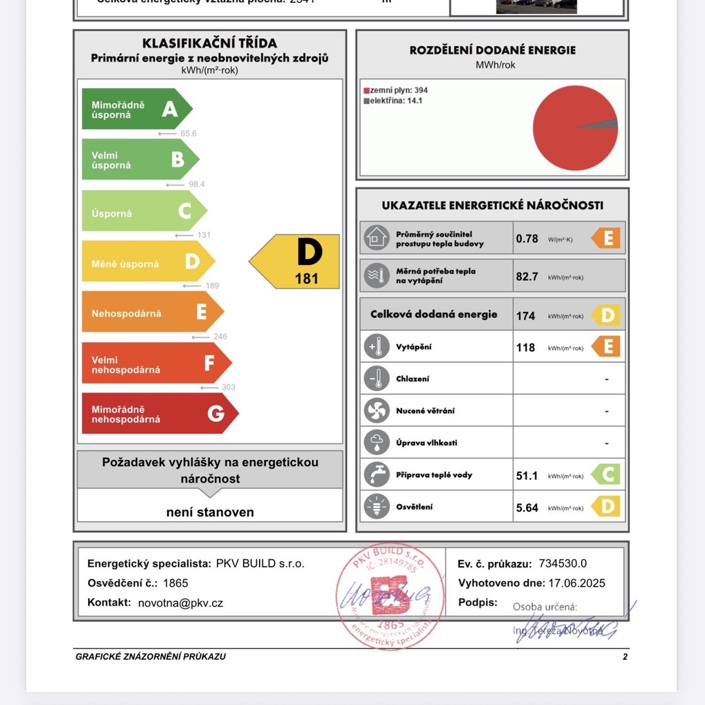 - Ukazatel energetické náročnosti budovy: 181 kWh/m²