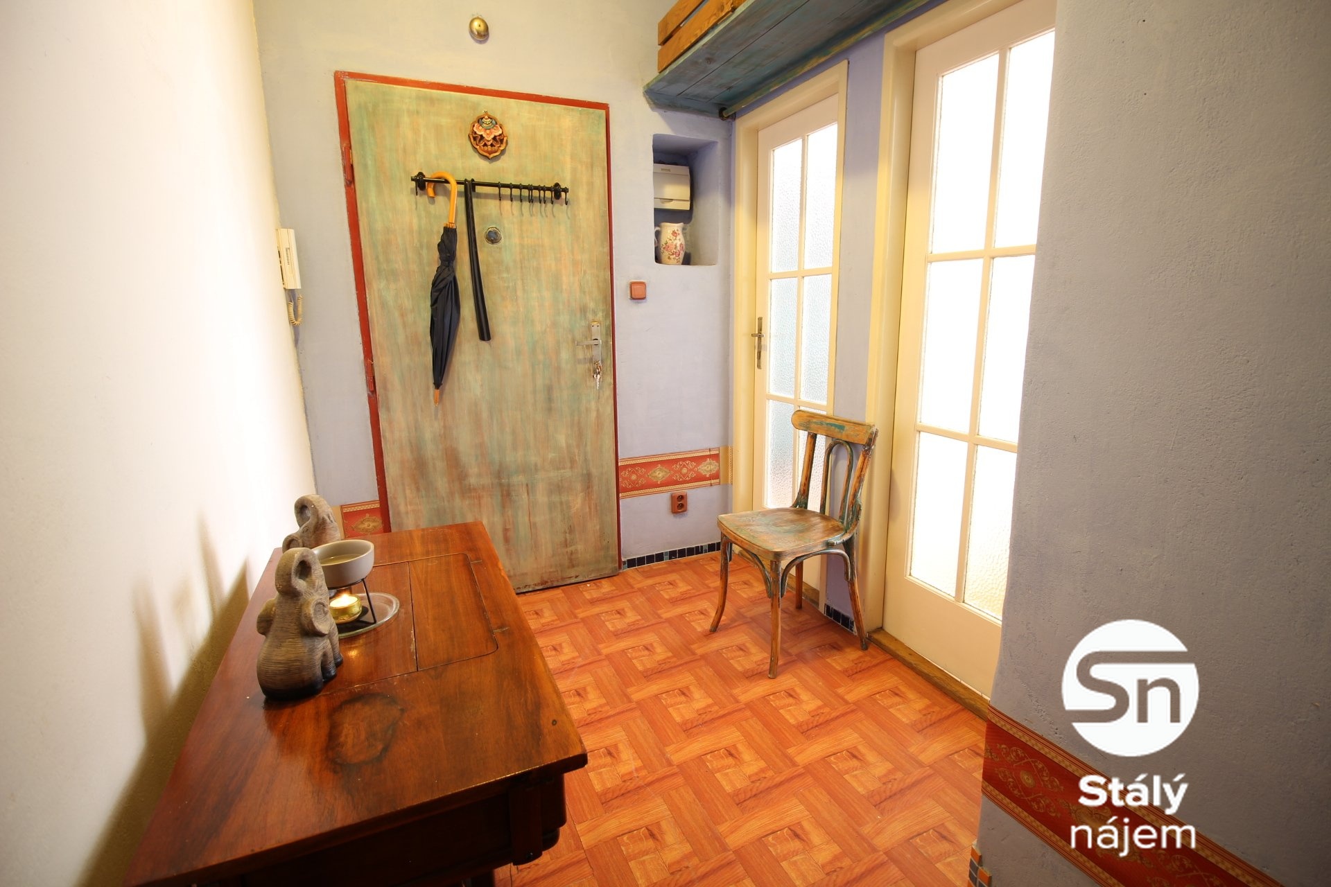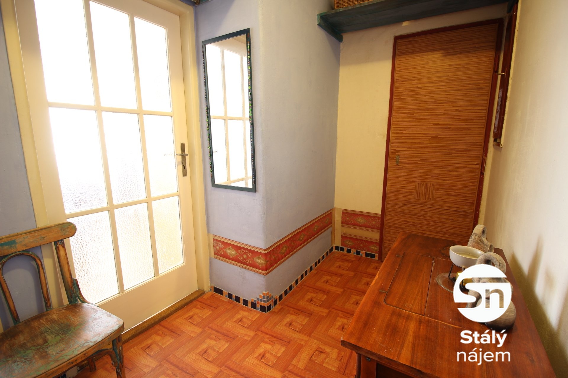 Obývací pokoj s kuch. koutem je situován na klidnou stranu s výhledem do vnitra. Stejně je tomu tak i u ložnice. Byt je vybaven kuchyňskou linkou s varnou deskou. Ostatní vybavení není součástí podnájmu. Koupelna je s vanou a je přístupná z ložnice a je zde i komora pro uložení potřebných věcí. WC je samostatné, což zvyšuje komfort bydlení. V předsíni se nachází prostor pro botník či věšák. Podlahy v bytě jsou kombinací parket a dlažby, což přispívá k příjemnému a útulnému prostředí. Byt je v dobrém stavu.