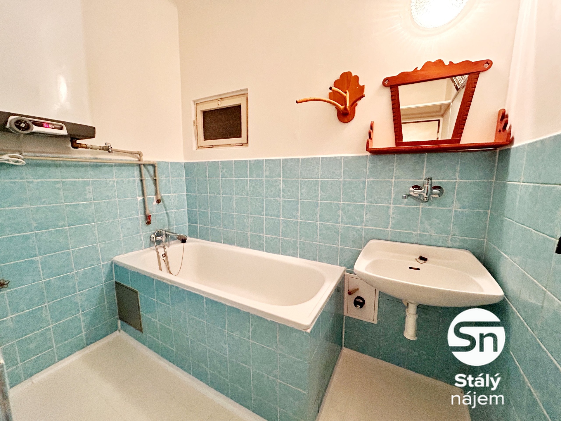 Koupelna nabízí umyvadlo s baterií, zrcadlo s policí, věšák, vanu s baterií a sprchovou hadicí, bojler, ohřívač a police nad dveřmi.