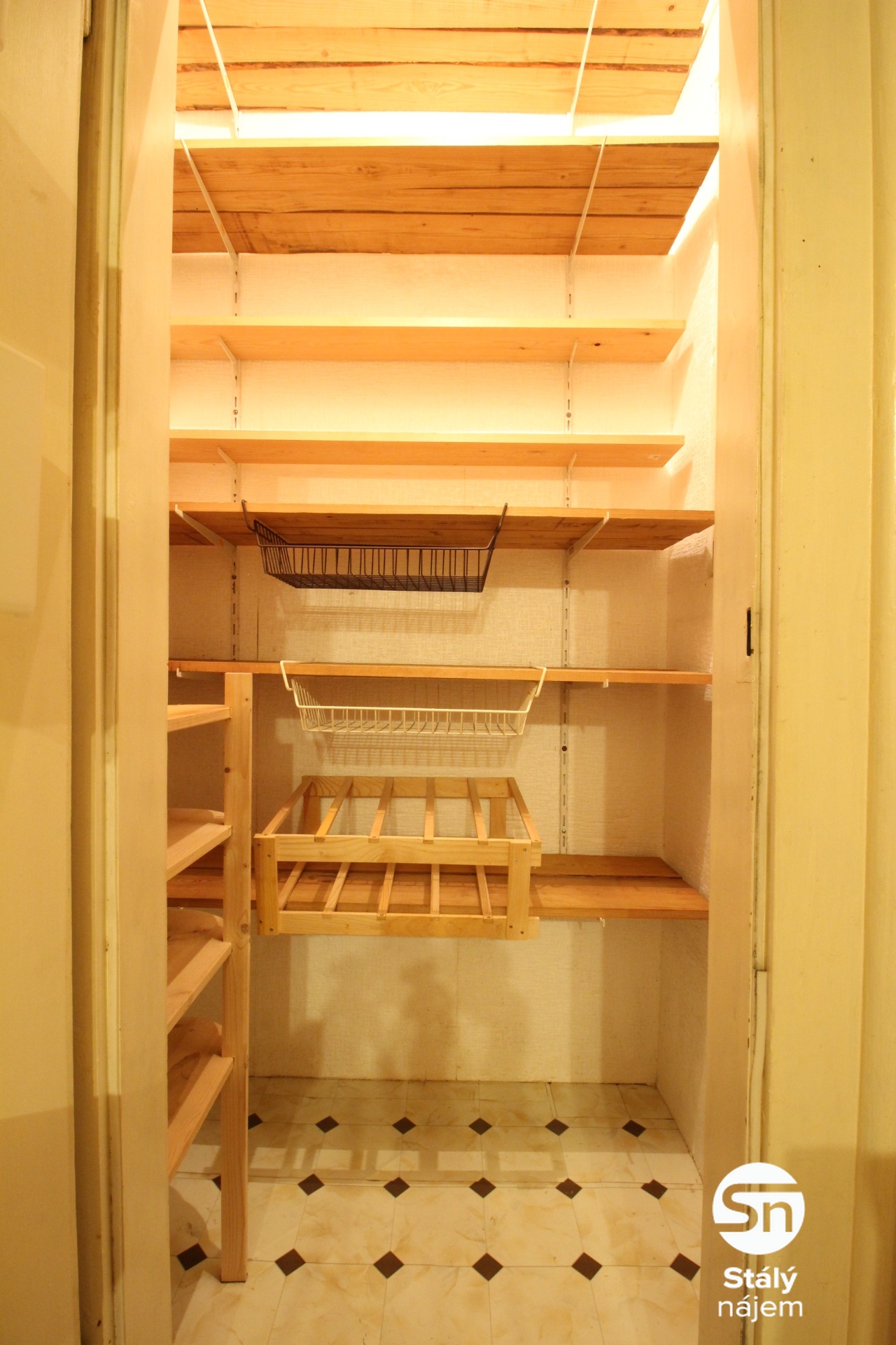 Kuchyň je plně vybavena kuchyňskou linkou se spotřebiči - el. sporákem, digestoří, lednicí s mrazákem a myčkou. Součástí kuchyně je také praktická komora, která může posloužit pro skladování potravin. Obývací prostor je rozdělen na jídelní kout, v druhé části je vestavěná skříň s výsuvnou postelí, která perfektně ušetří prostor v domácnosti.