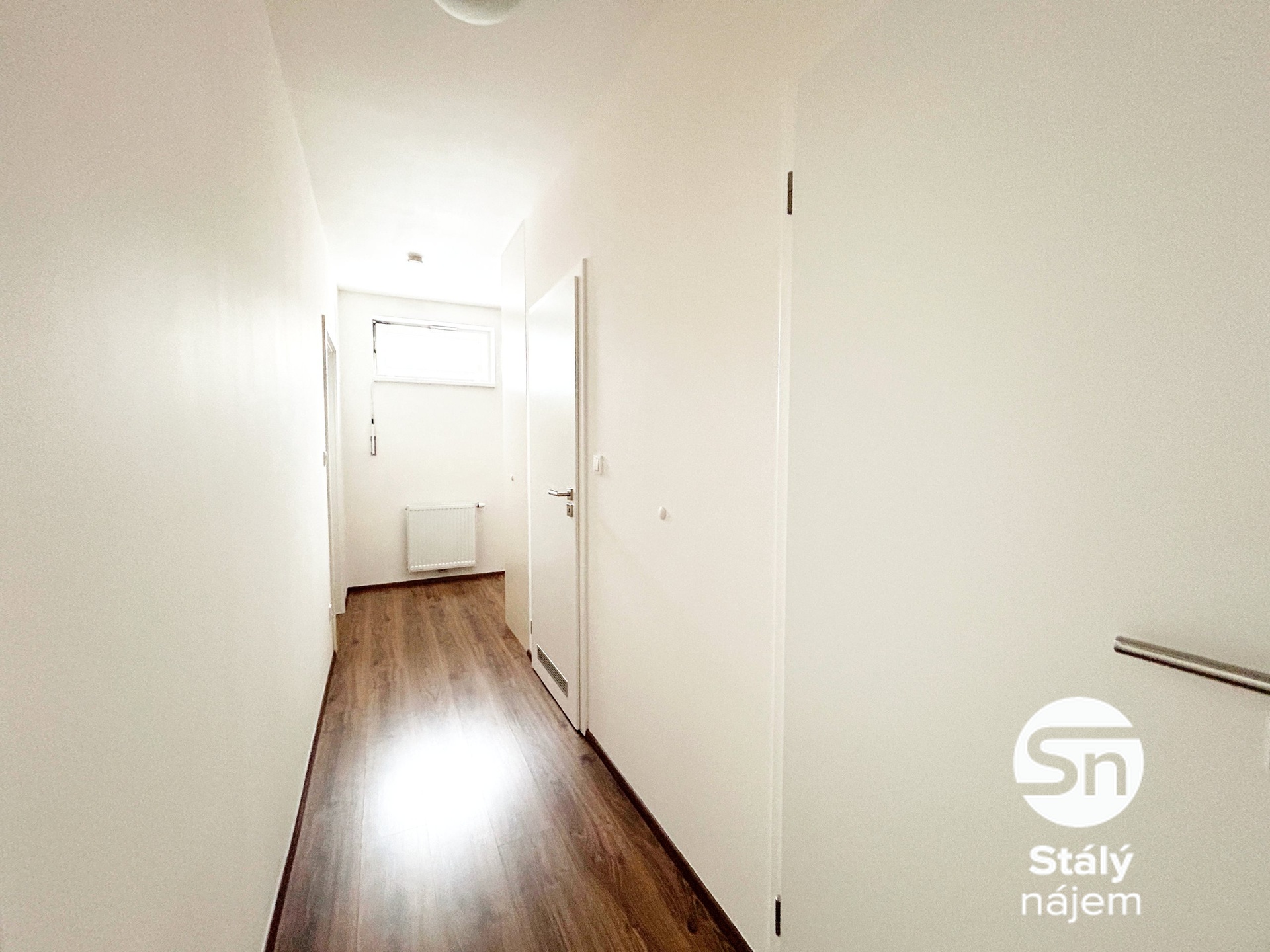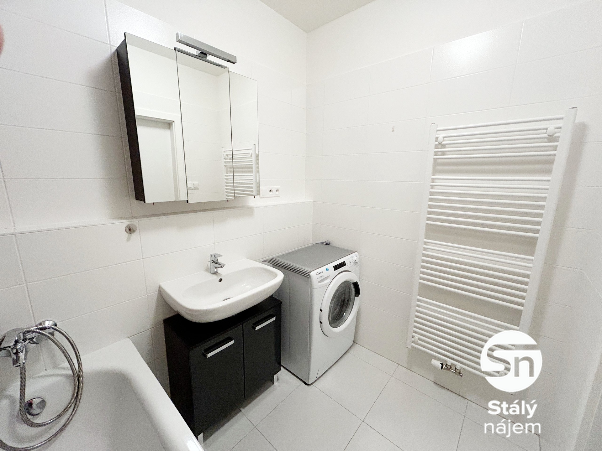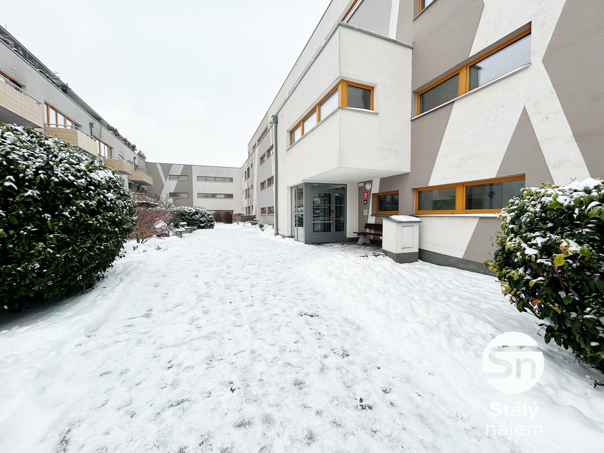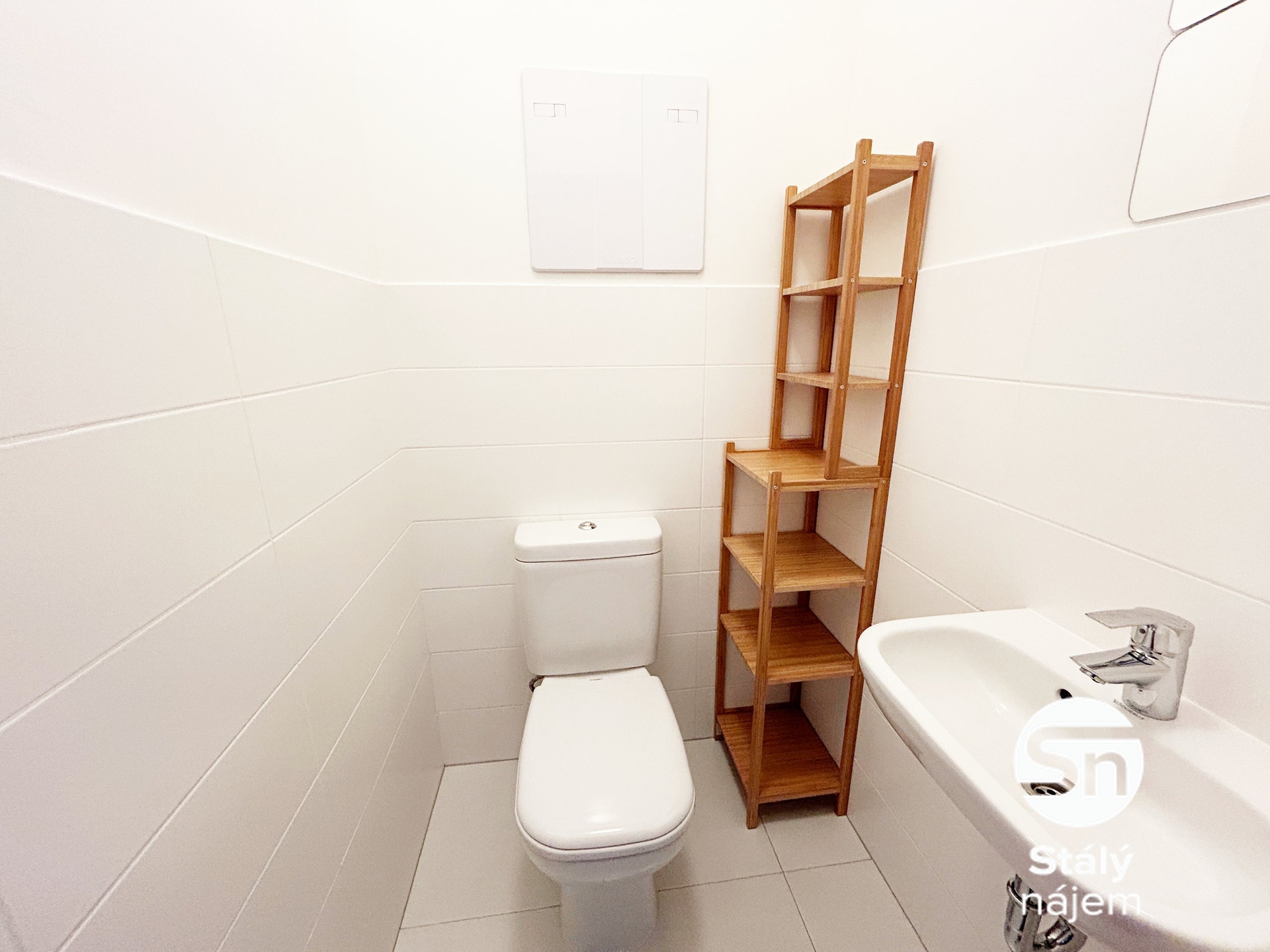 Byt disponuje koupelnou s vanou a praktickou vestavěnou skříní v chodbě, která poskytuje dostatek úložného prostoru. Součástí podnájmu je sklep, dále dvě garážová stání, k dispozici je také kočárkárna.