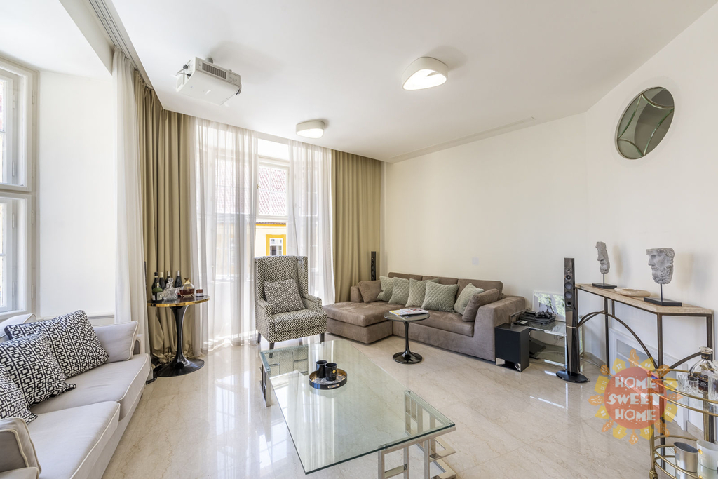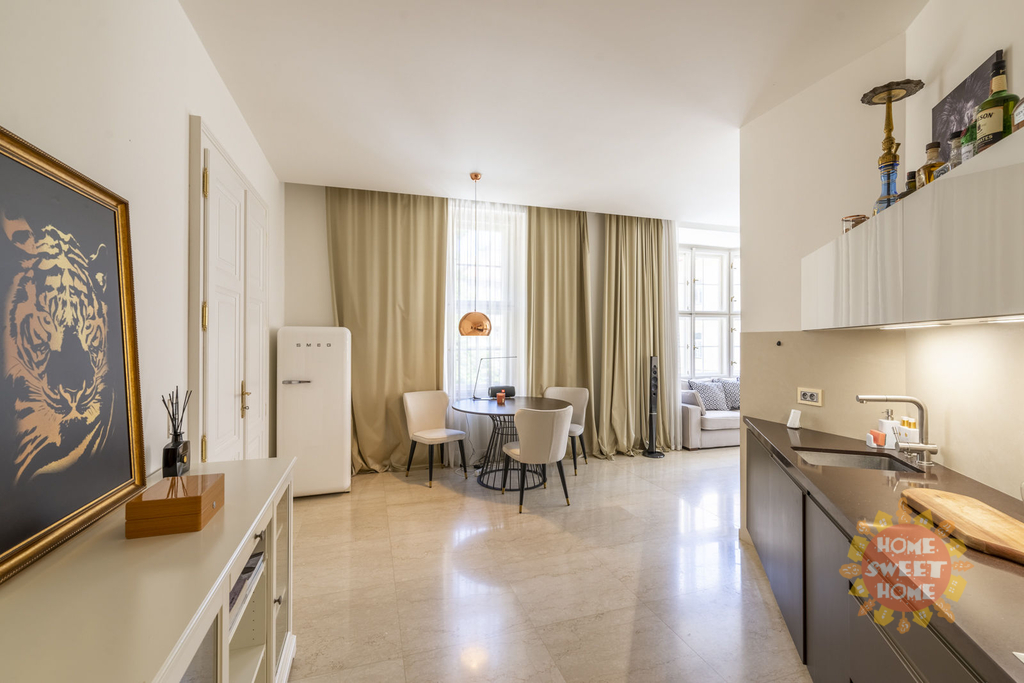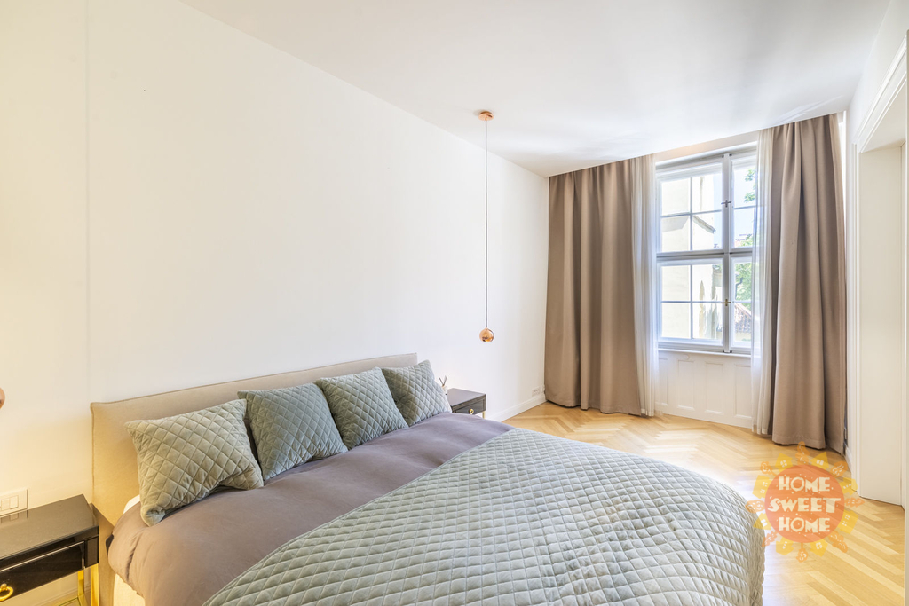 Nabízíme Vám k pronájmu luxusní zařízený byt 2+kk o celkové rozloze 82 m2, který se nachází v 1. patře plně zrekonstruovaného domu na Praze 1 - Staré Město. Z arkýřových oken v obývacím pokoji je krásný výhled na Staré město. Kuchyně je zařízená sklokeramickou varnou deskou, myčkou a lednicí s mrazničkou. V koupelně je sprchový kout. V bytě je také pračka a sušička. Na podlahách jsou parkety a dlažba. Podlahové vytápění. K dispozici je internetové připojení. V bytě jsou použity velmi kvalitní materiály a vybavení, které zahrnují například mramorovou podlahu Botticino classico, velkoformátovou dlažbu a obklady, podlahové vytápění, dobové repliky vstupních i interiérových dveří, renovovaná špaletová okna, sanitu značek Flaminia a Zazzeri, domácí kino s projektorem, zabudovaným plátnem a blackout závěsy, datové rozvody s centrálním uložištěm a nové elektrické rozvody s koncovými prvky Bticino. Dům se nachází v atraktivní lokalitě historického centra Prahy s vynikající občanskou vybaveností - restaurace, obchody, kavárny a jiné. Skvělá dopravní dostupnost - tramvajová zastávka 4 minuty chůze od domu, stanice metra "B" Náměstí republiky 8 minut chůze.