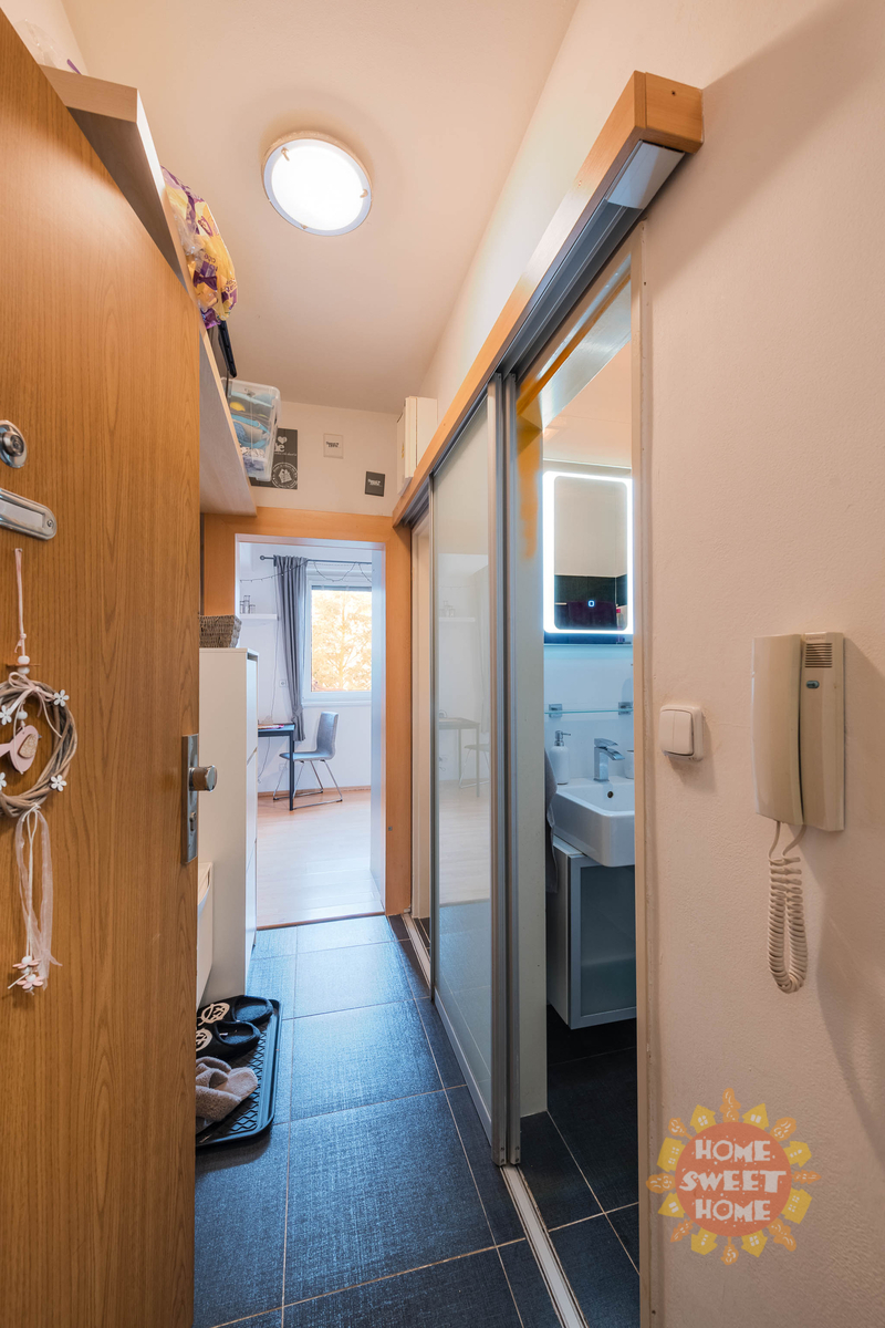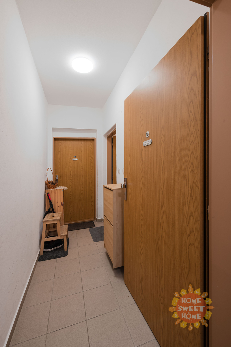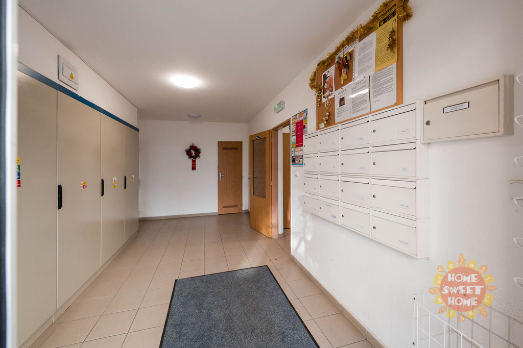 Byt sestává ze vstupní chodby, obývacího prostoru s plně vybaveným kuchyňským koutem elektrickými a kvalitními spotřebiči (vestavěná elektrická trouba se sklokeramickou varnou deskou, myčka na nádobí, lednice s mrazničkou, mikrovlnná trouba), koulena s vanou a pračka, zvlášť toaleta. V koupelně a na toaletě je k dispozici podlahové vytápění. Byt je vytápěn ústředním vytápěním, na podlaze je dlažba a plovoucí podlaha. Možnost parkovacího stání za měsíční poplatek 700,-Kč.